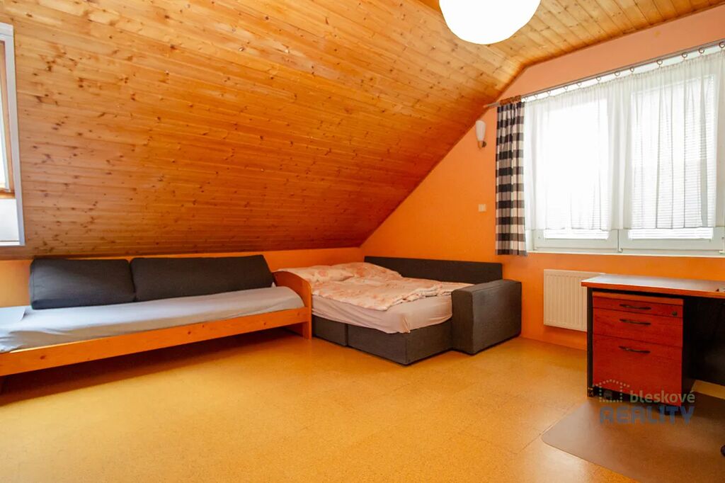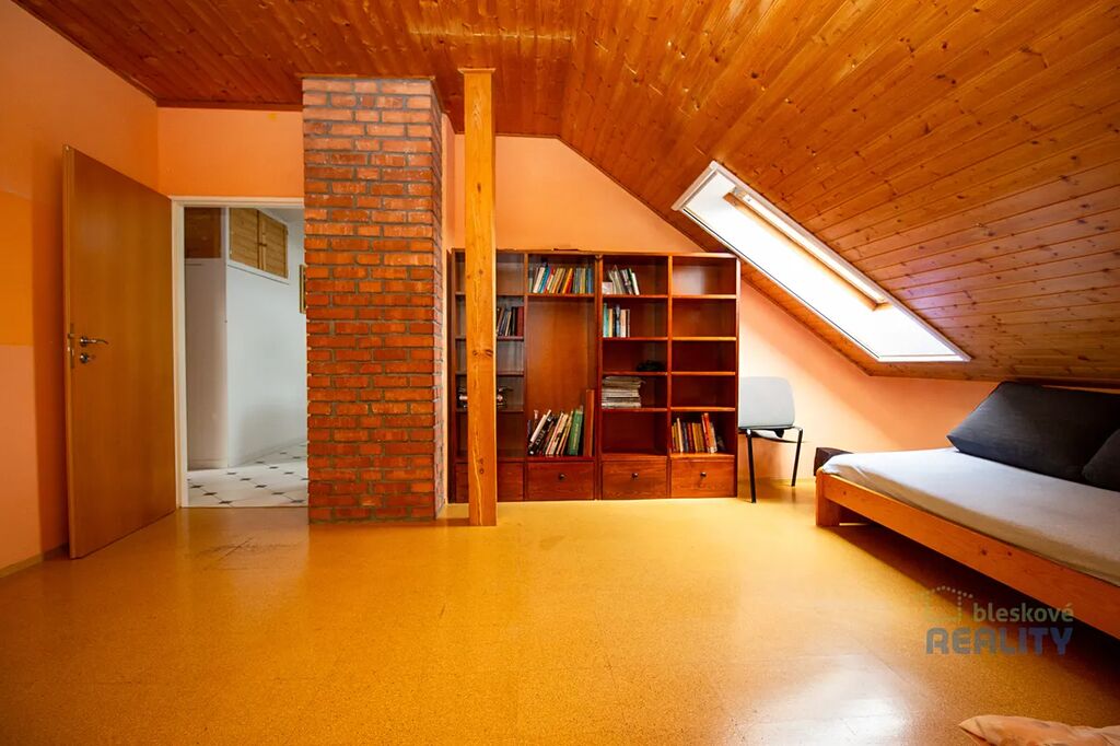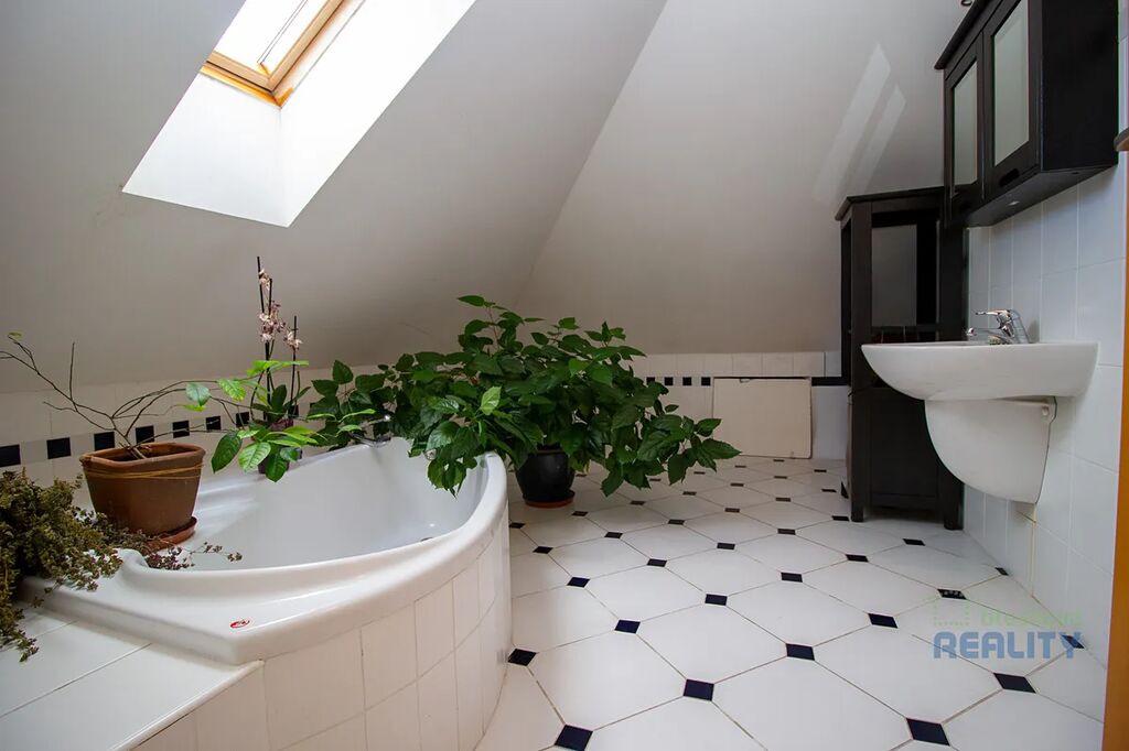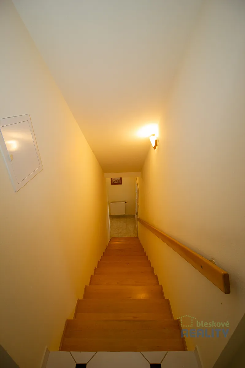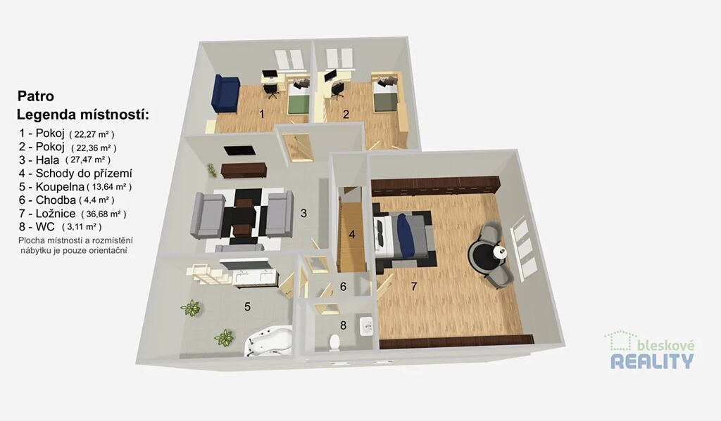 V patře jsou tři pokoje, hala, ložnice, koupelna a samostatné WC.