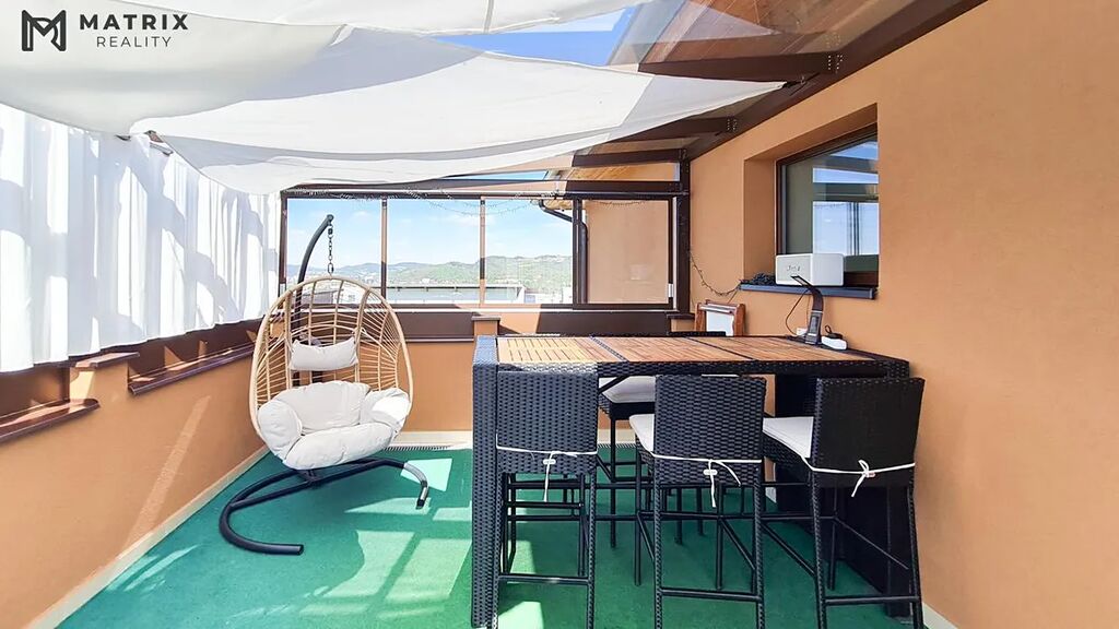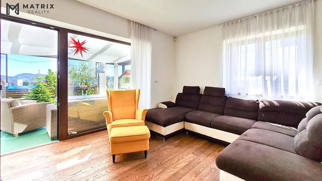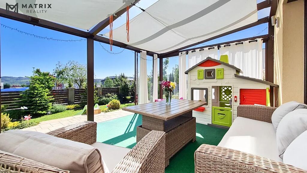 Upstairs, there are three cozy bedrooms and a large bathroom equipped with a bathtub, shower, and sauna. A Miele washer and dryer are also available. From here, you can access the second glazed terrace with beautiful views of Beroun and Králův Dvůr, currently serving as a relaxation room with a bar seating area.