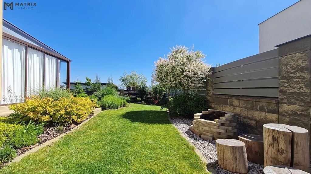 Kolem domu je dostatek parkovacích míst i pro návštěvy a okrasná zahrada je navržená zahradním architektem tak, aby přinášela radost po celý rok. Díky automatické závlaze napojené na vlastní studnu a robotické sekačce zůstává její údržba minimální.
