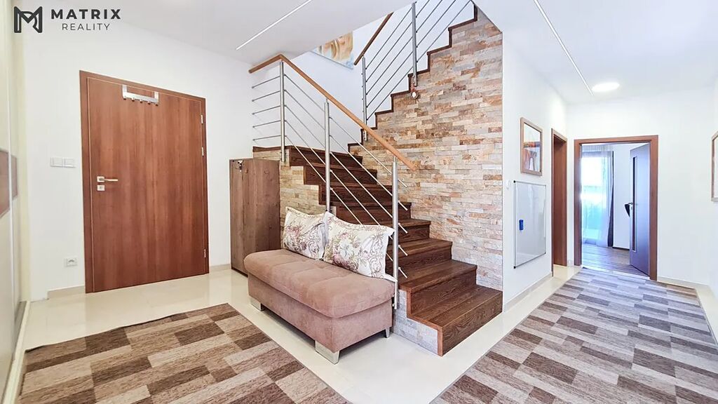 V přízemí vás přivítá prostorná vstupní hala s vestavěnými skříněmi a šatnou. Otevřený obývací pokoj je propojený s moderní kuchyní a nabízí přímý vstup na prosklenou terasu ideální pro rodinné chvíle i setkání s přáteli. Součástí přízemí je také ložnice s vlastní koupelnou, samostatné WC pro hosty a vstup do garáže.
