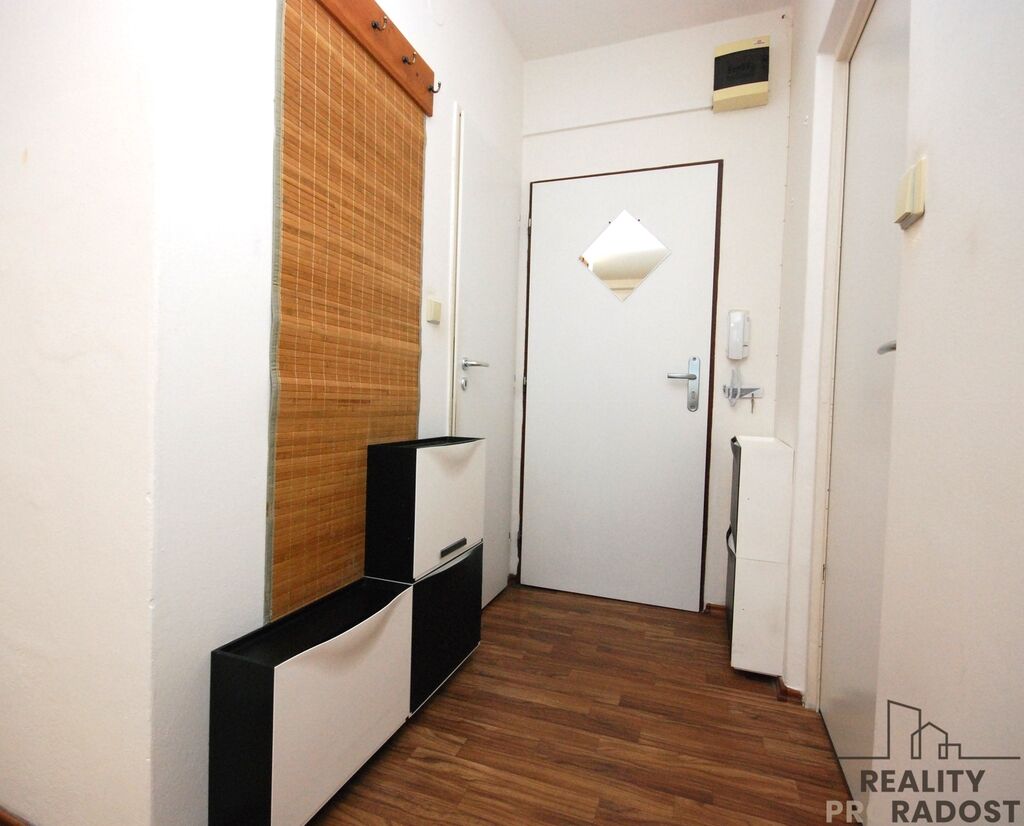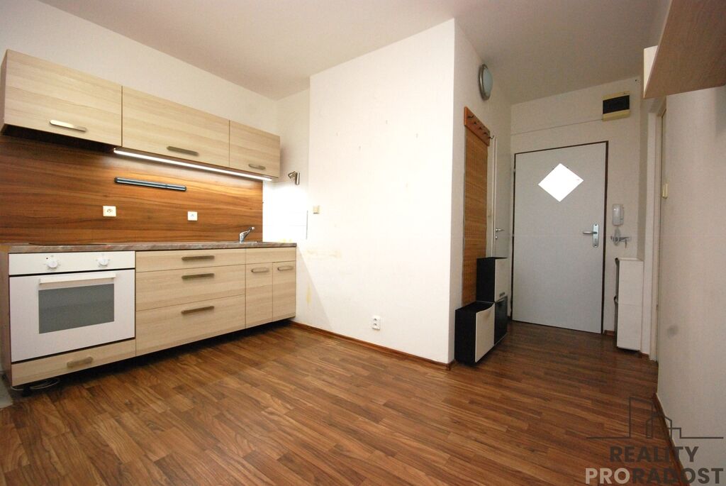 Dispozice bytu: vstupní chodba, koupelna se sprchovým koutem, umyvadlem, WC a místem na pračku, kuchyně, ložnice se vstupem na balkon. Byt je částečně vybavený – v ložnici se nachází šatní skříň a pohovka, v kuchyni kuchyňská linka s troubou a sklokeramickou varnou deskou (bez lednice).