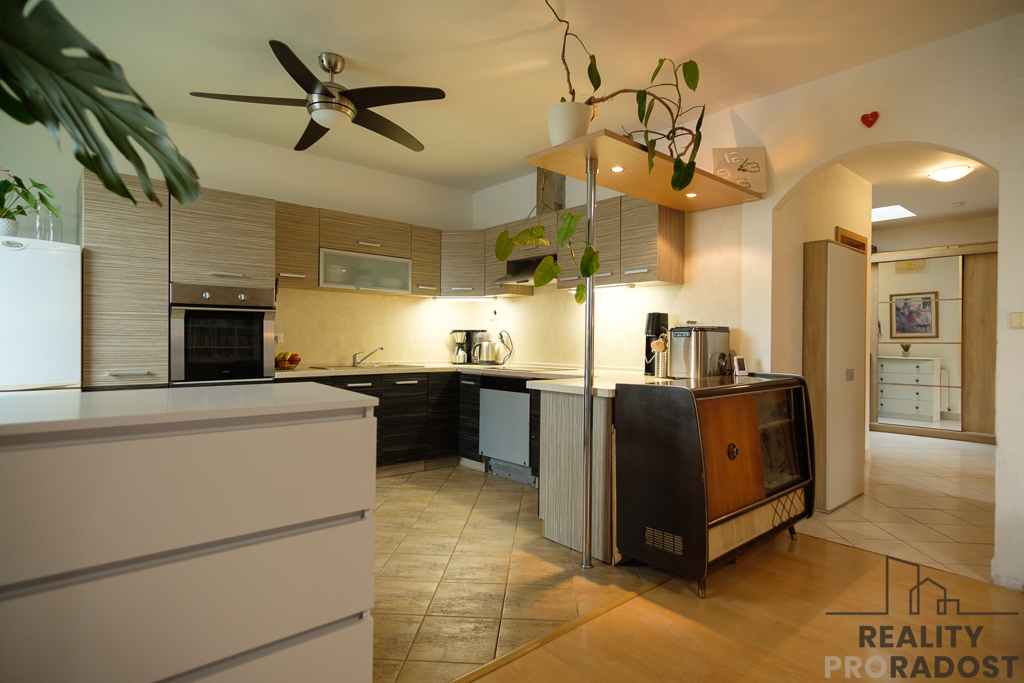 Podlaha v obývacím pokoji je plovoucí laminátová, v kuchyňské části, v předsíni, koupelně a na WC je keramická dlažba, v pokojích koberce. Okna jsou plastová. Předností bytu je topení a ohřev TUV vlastním plynovým kotlem (Junkers), umístěným v koupelně. Byt je klidný, s nízkými provozními náklady.