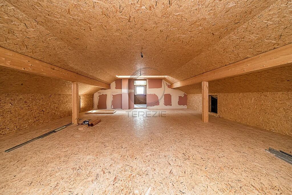 V přízemí domu se nachází obývací pokoj s přípravou na krb, prostor pro kuchyňský kout se vstupem na terasu, 3 samostatné ložnice, koupelna, toaleta, technická místnost a šatna s žebříkem do podkroví. V podkroví tohoto domu se nachází další prostor o výměře cca 100 m2, který může sloužit jako ateliér/herna/kancelář.