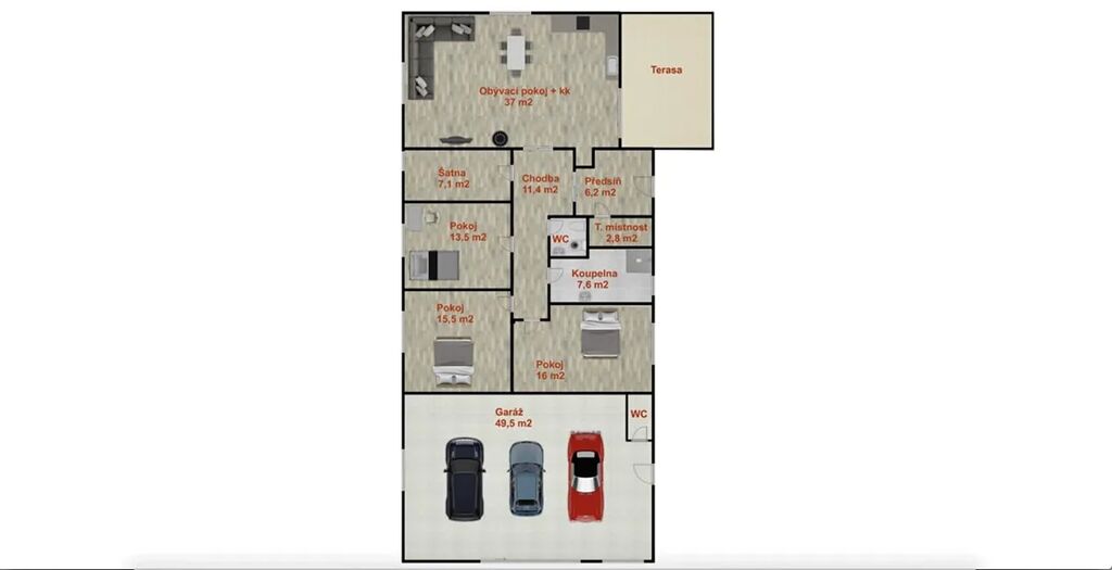 Součástí domu je i prostorná vytápěná garáž minimálně pro 3 automobily, která může sloužit i jako dílna. V garáží též najdeme samostatnou toaletu a je pamatováno i na úložný prostor, který se nachází nad celou plochou garáže.