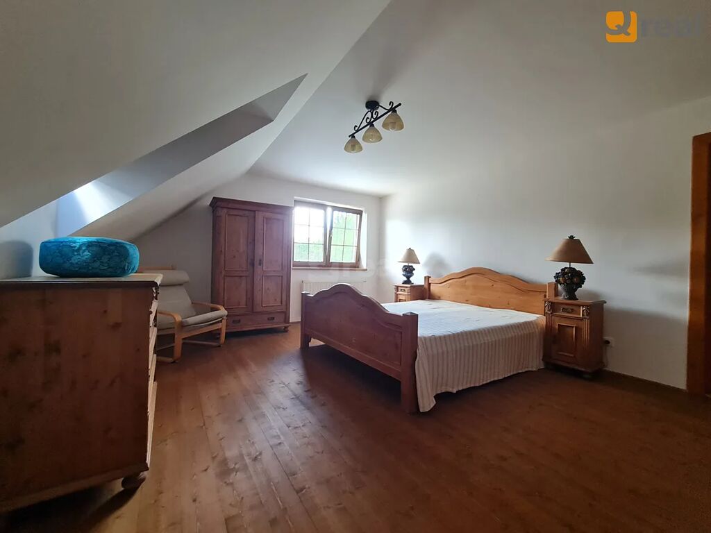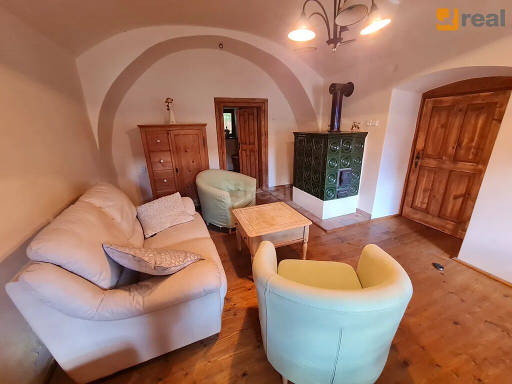 Hlavní budova o dispozici 7 + 1 se dvěma koupelnami, samostatným WC, pěti ložnicemi, kuchyní se spížkou a sklípkem, prostornou jídelnou s kachlovými kamny, pracovnou, obývacím pokojem.
