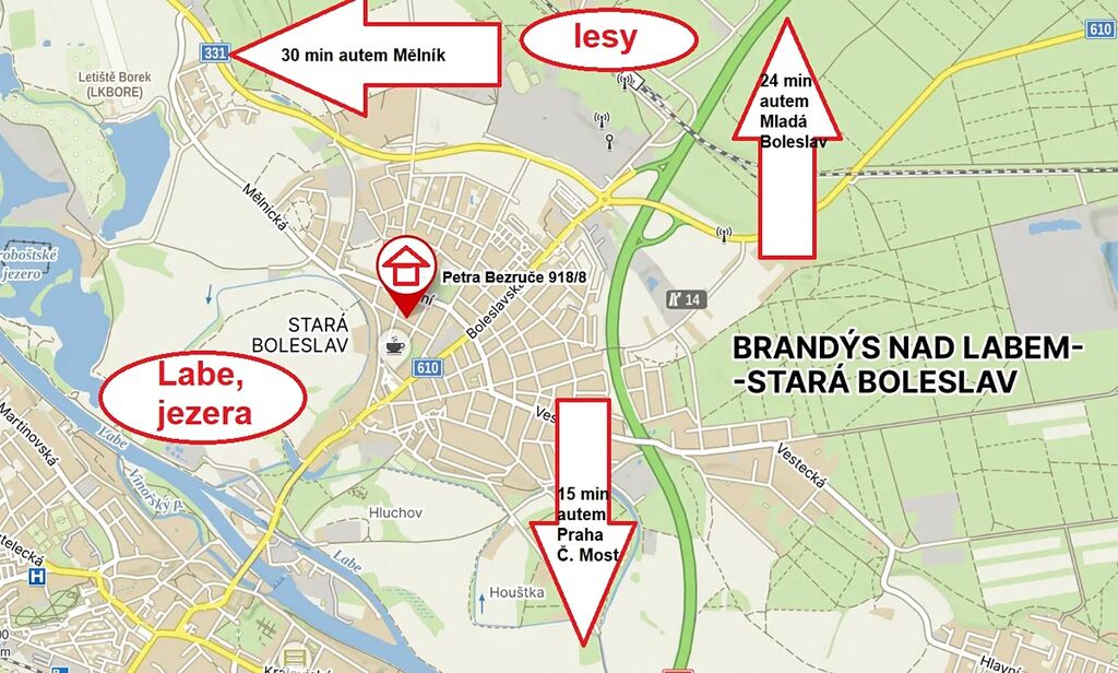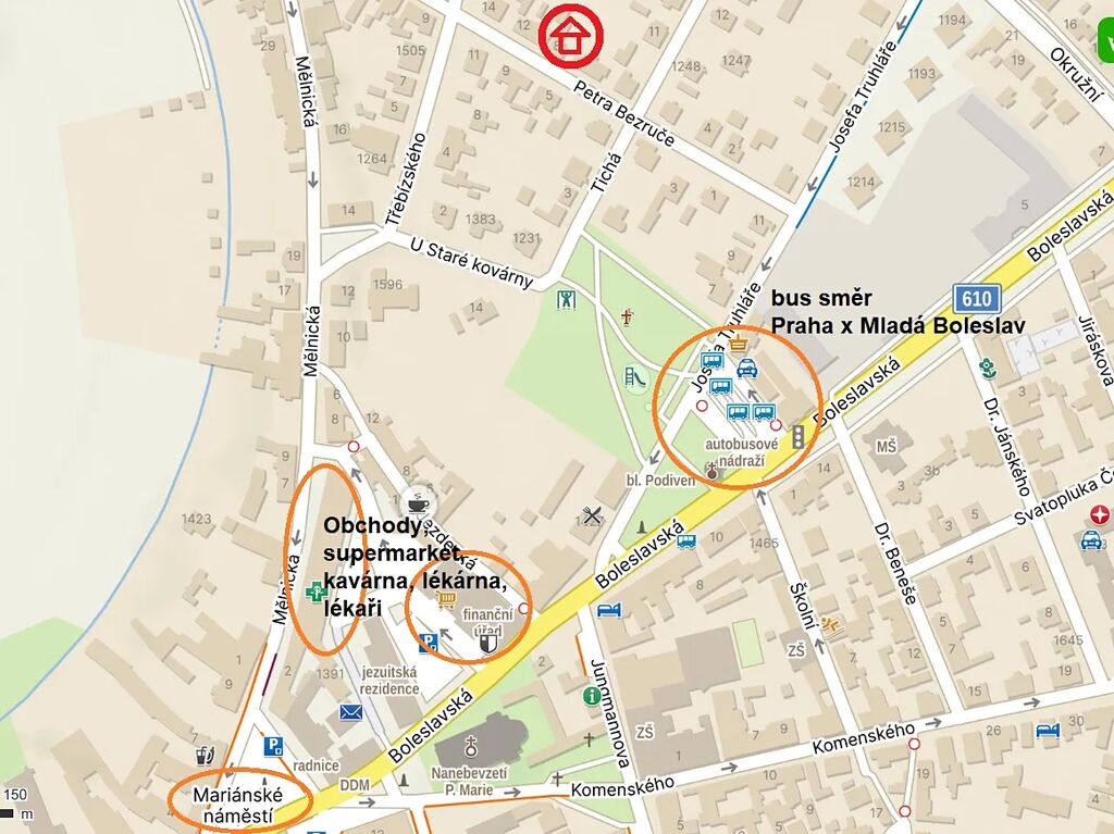 Stará Boleslav je výborně dopravně dostupná autem, autobusem i vlakem. Z domu dojedete během 3 minut na dálnici D10 (Praha – Mladá Boleslav). Přímo od domu budete do 15 minut v Praze na Černém mostě. Vlaková zastávka je od domu vzdálená 1000 m (15 minut chůzí) a vlaky jezdí směr Mělník, Ústí n. Labem a Lysá n. Labem, Poděbrady.