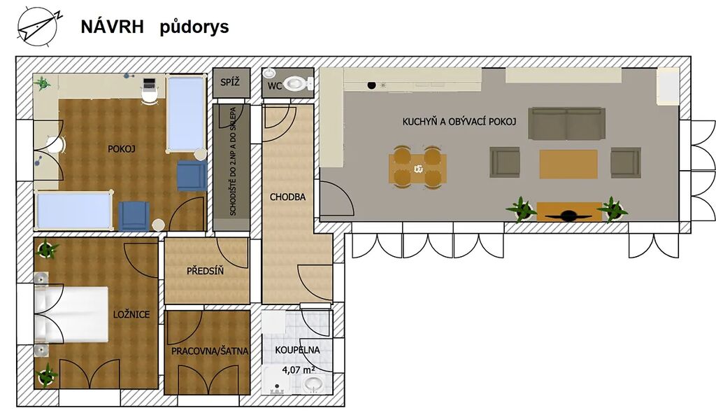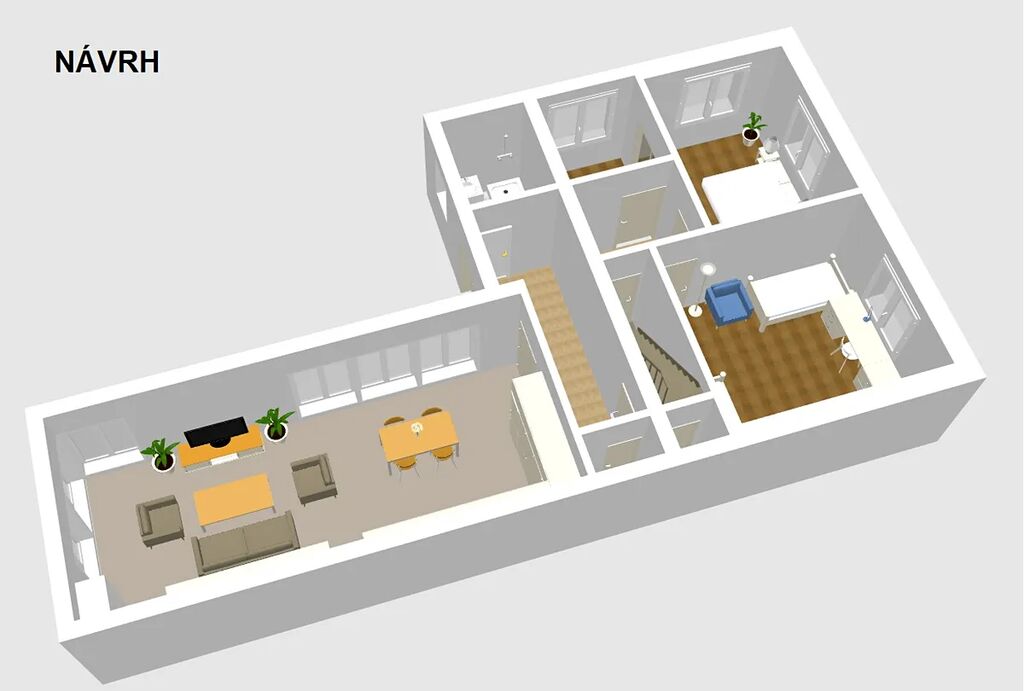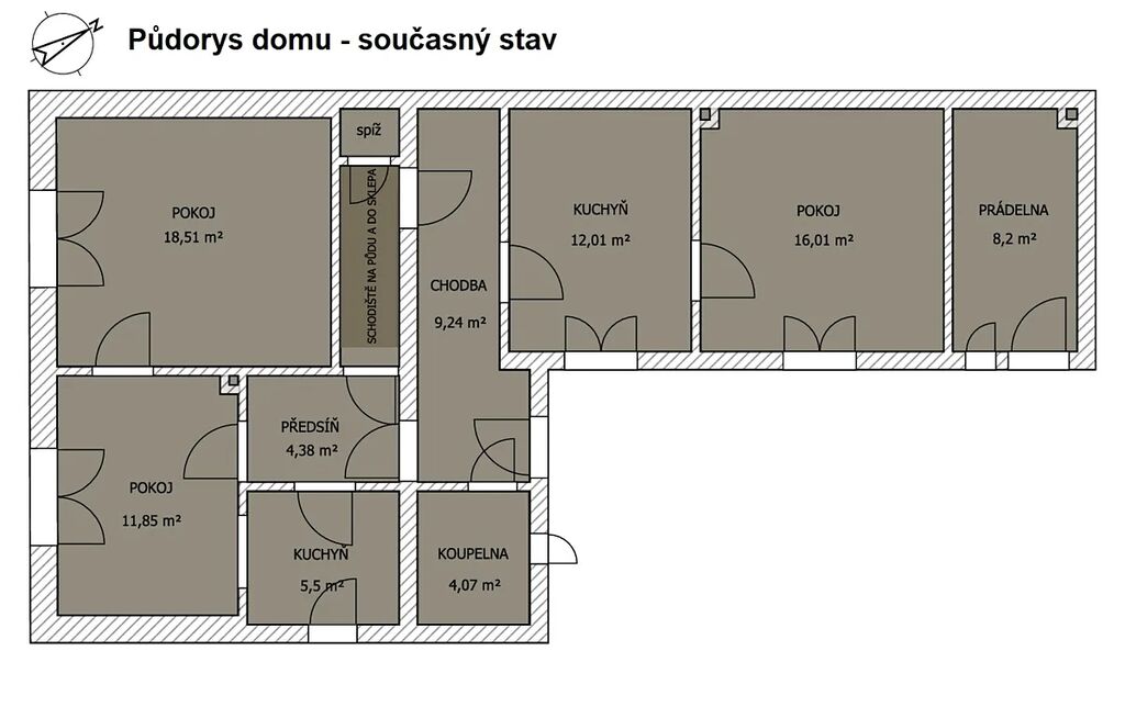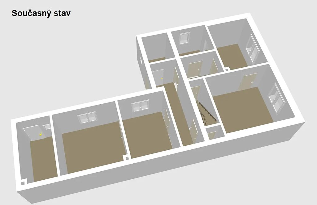 Dům je cihlový, suchý, se současnou dispozicí 2+1 a 1+1 s možností půdní vestavby a nabízí velké možnosti pro rekonstrukci.