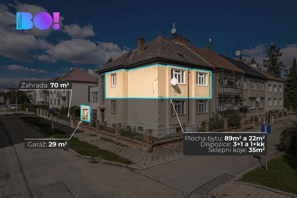 Byt se rozkládá ve 2. NP, kde najdete hlavní část o velikosti 89 m², řešenou jako 3+1 – obývací pokoj, kuchyni s jídelnou a dva samostatné pokoje.