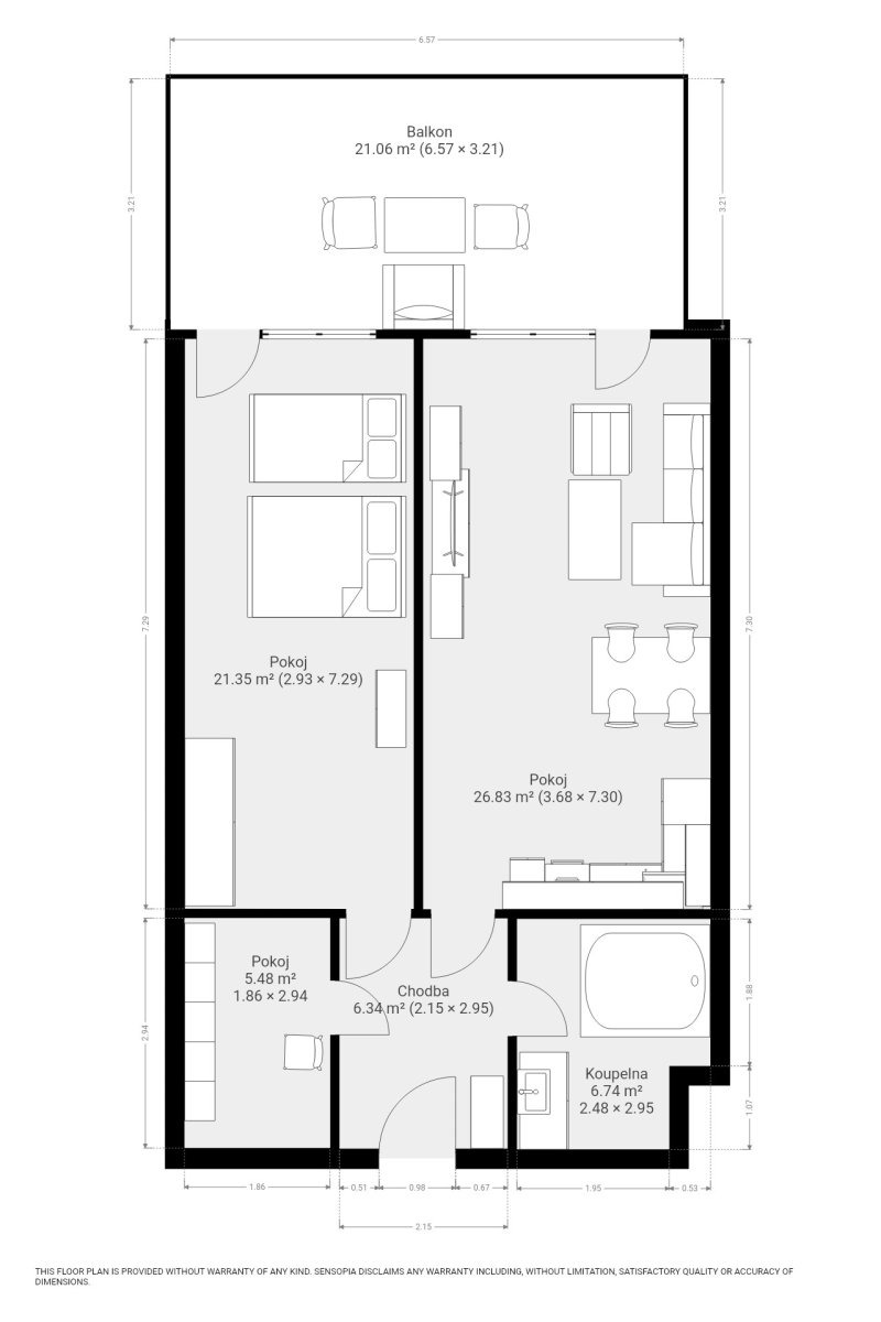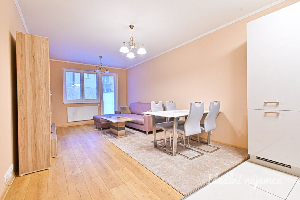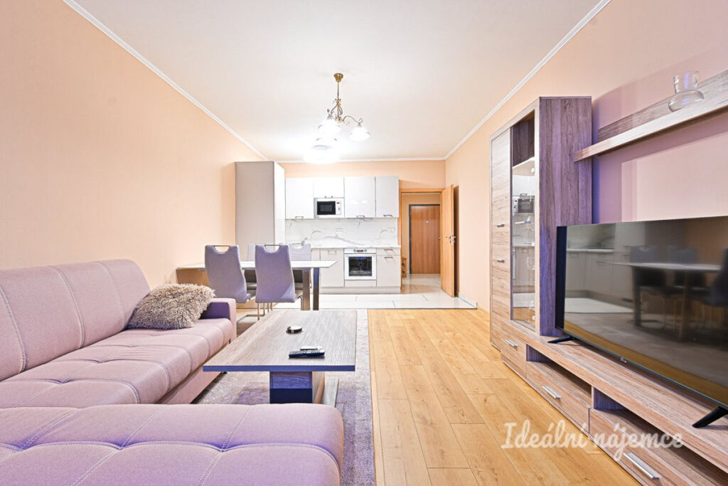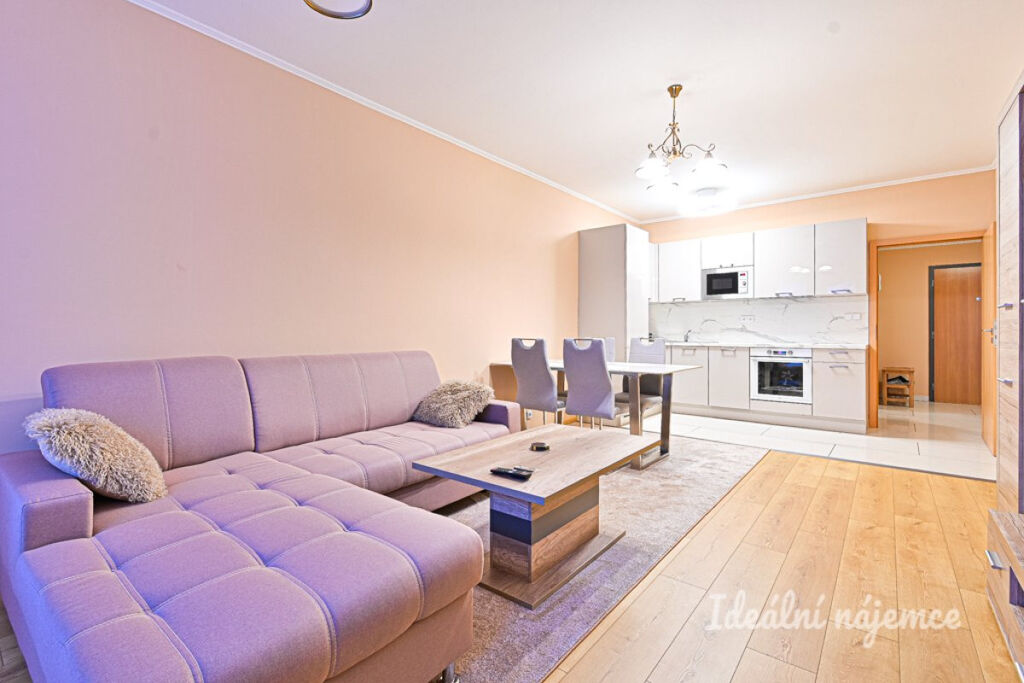 Byt je plně vybavený. Kuchyňská část disponuje moderní linkou, která zahrnuje lednici, myčku, troubu, mikrovlnnou troubu, varnou desku a digestoř. Obývací prostor je zařízen pohodlnou sedací soupravou, konferenčním stolkem, jídelním stolem a televizí. Ložnice nabízí pohodlné postele a prostornou šatní skříň.