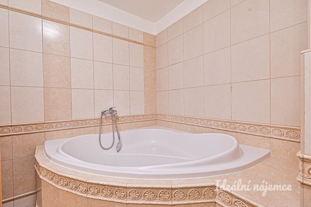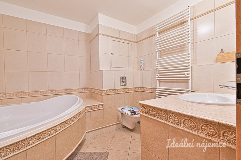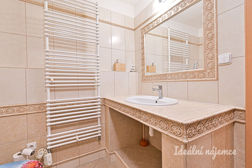 V koupelně najdeme vanu, umyvadlo a topný žebřík. Byt dále nabízí velkorysou terasu s venkovním posezením, která je ideální pro odpočinek nebo grilování.