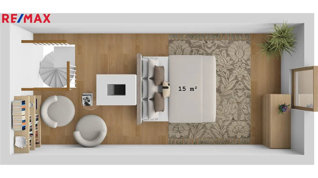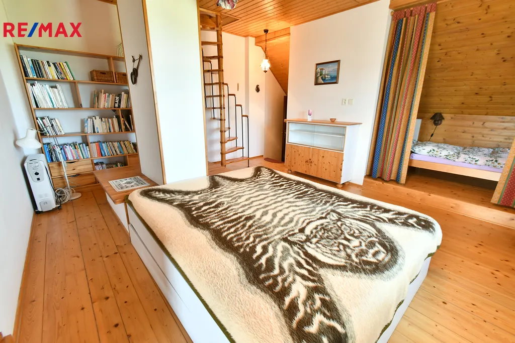 V přízemí se nachází předsíň, jídelna s kuchyňským koutem, obývací pokoj, technická místnost, chodba s úložným prostorem v mezipatře a koupelna s WC. Do 1. patra vede dřevěné schodiště, kde najdete prostornou ložnici s dvěma oddělenými prostorami a vstup na menší terasu. Další schodiště vede do sníženého podkroví, které slouží jako druhá ložnice.