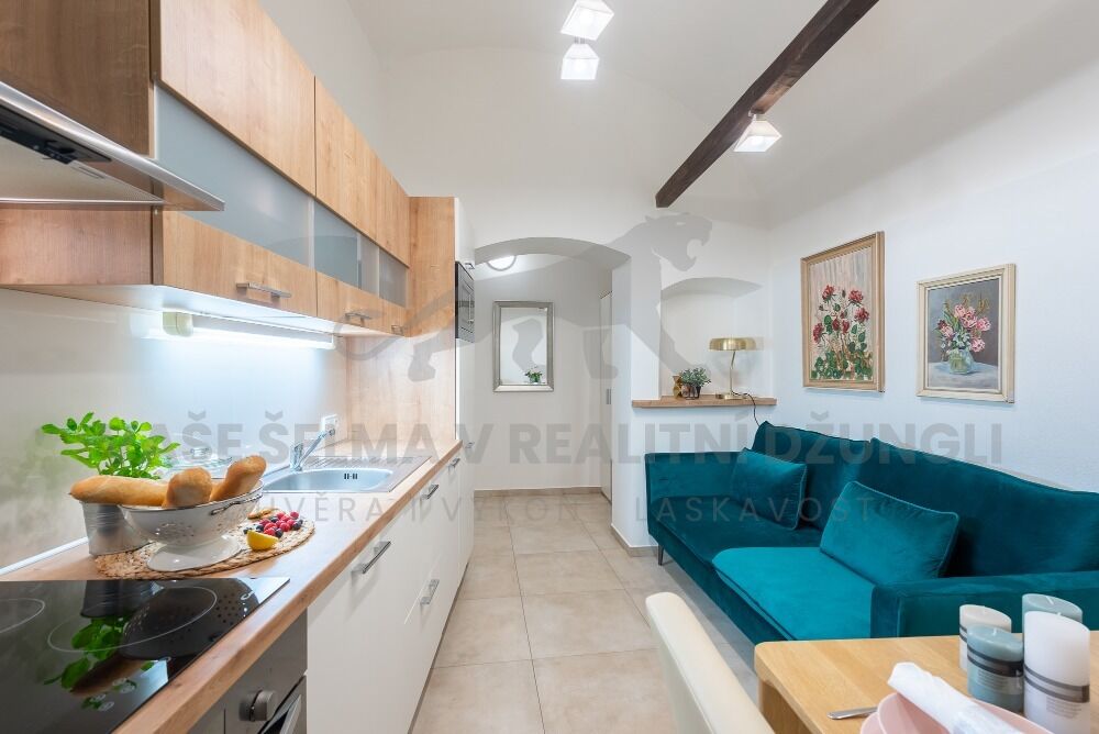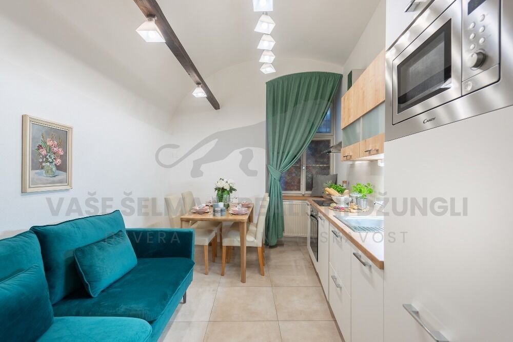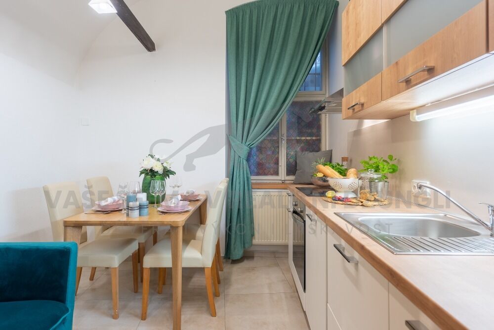 byt zařízený, kuchyň s vestavěnými spotřebiči + pračkosušička.