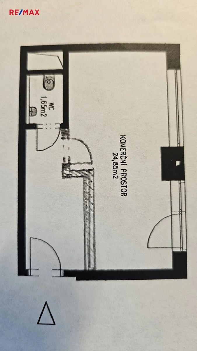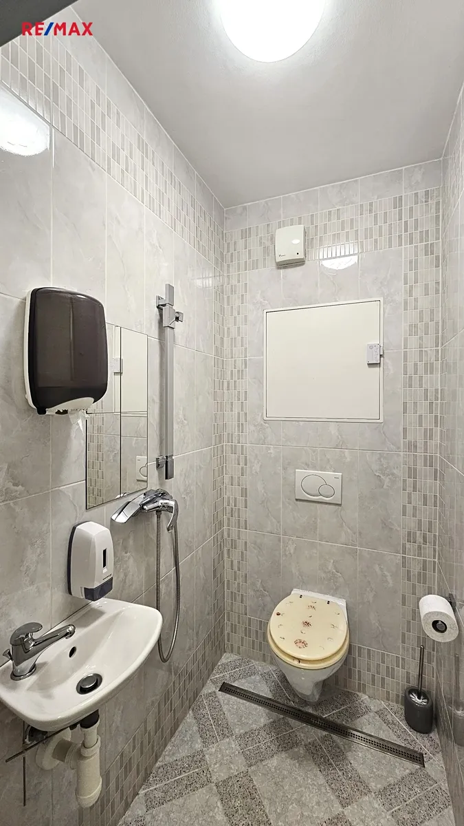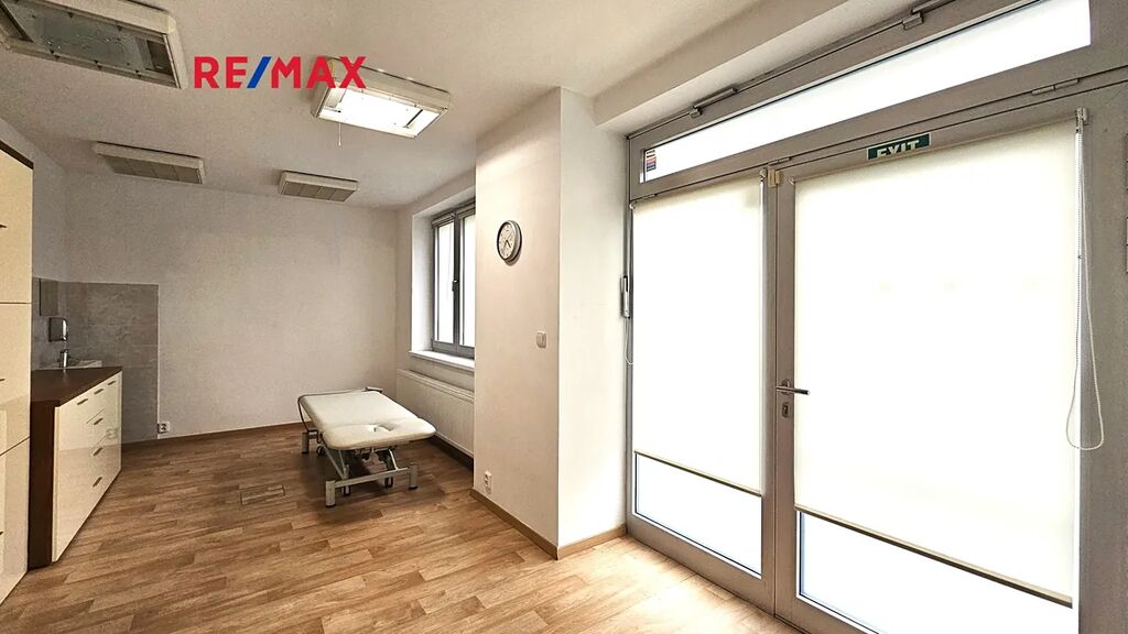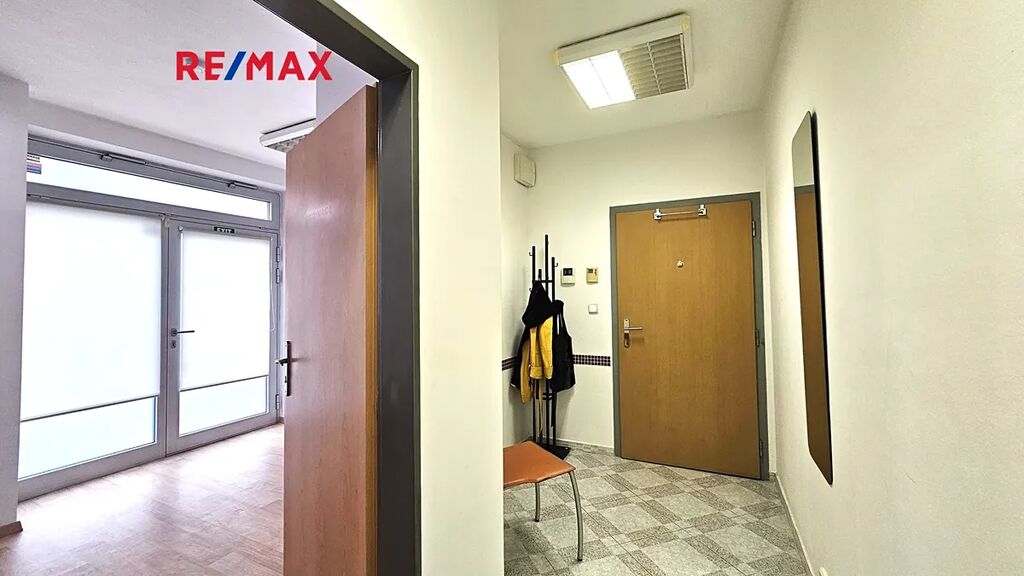 Jednotka má dva vchody, jeden z ulice, druhý z vnitřku domu a je velmi prakticky provedená. Sestává z prostorné předsíně, samostatné místnosti, kde je nyní umyvadlo, je možné zde udělat kuchyňský kout a samostatné toalety s umyvadlem a sprchou. Jednotka je hezky prosvětlená, díky velkým oknům a skleněným dveřím. Na oknech i dveřích je kromě rolety i diskrétní fólie, díky které do jednotky z klidné ulice není vidět.