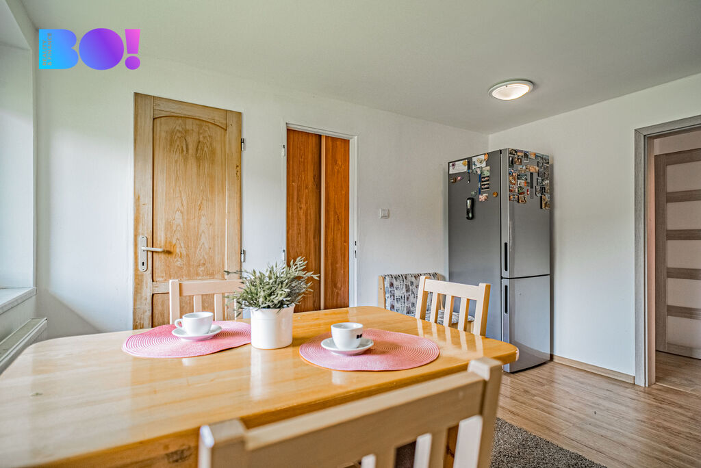 Dvě plnohodnotná podlaží přirozeně rozdělují dům na dva prostorné byty. Každé patro má tři pokoje, samostatnou kuchyni a koupelnu s toaletou. Současná dispozice nabízí pohodlné bydlení bez nutnosti okamžitých úprav, přesto skýtá mnoho možností pro přetvoření podle vašich představ.
