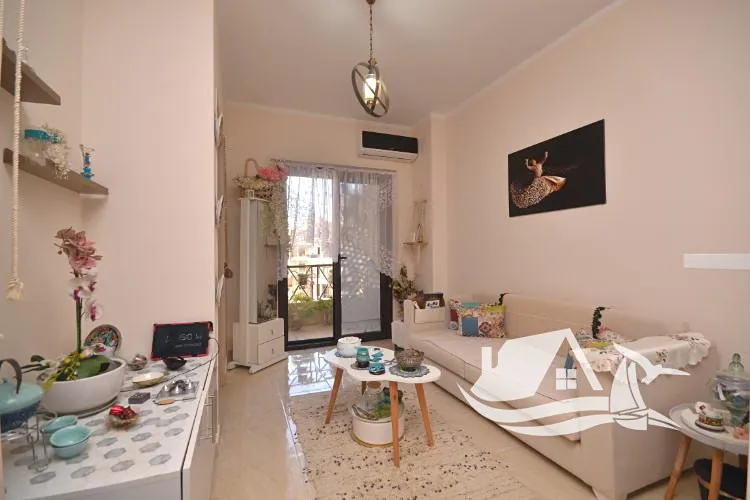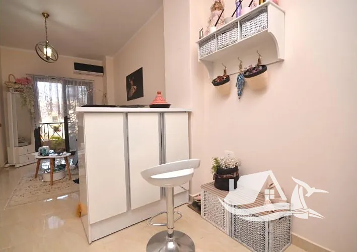 Apartmán je plně zařízený a vybavený: TV, klimatizace, ohřívač vody, pračka. Kuchyně disponuje bílými dřevěnými skříňkami, mramorovou pracovní deskou a vestavěnými spotřebiči (sporák, lednice, pračka). Interiér laděný do světlých tónů s tyrkysovými a šedými akcenty působí vzdušně, elegantně a útulně.