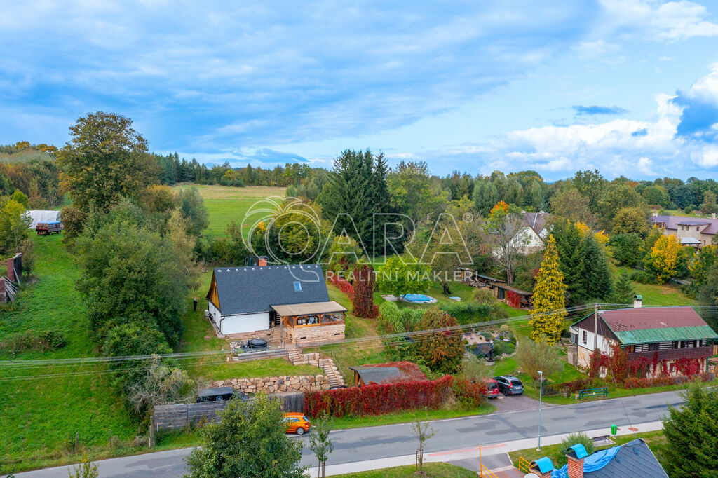 Dům je zděný, částečně roubený a nabízí dispozici 4+kk: