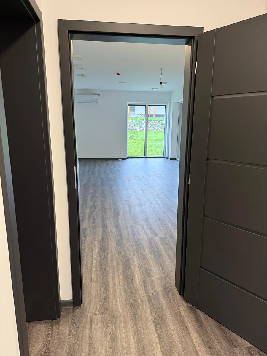 Okna – plastová,barva antracit-trojsklo, venkovní žaluzie , vstupní dveře - plastová , barva antracit.
