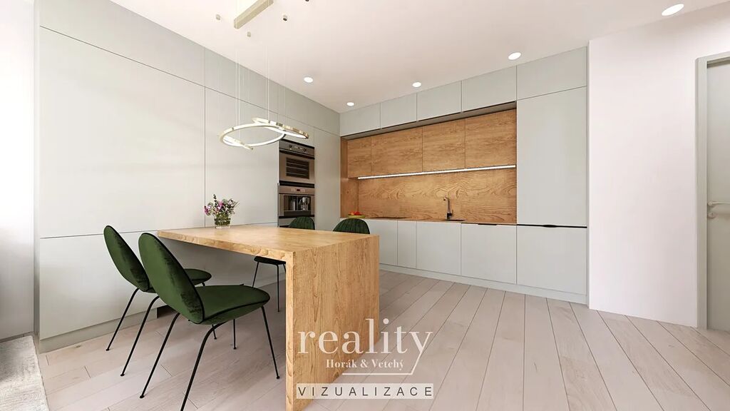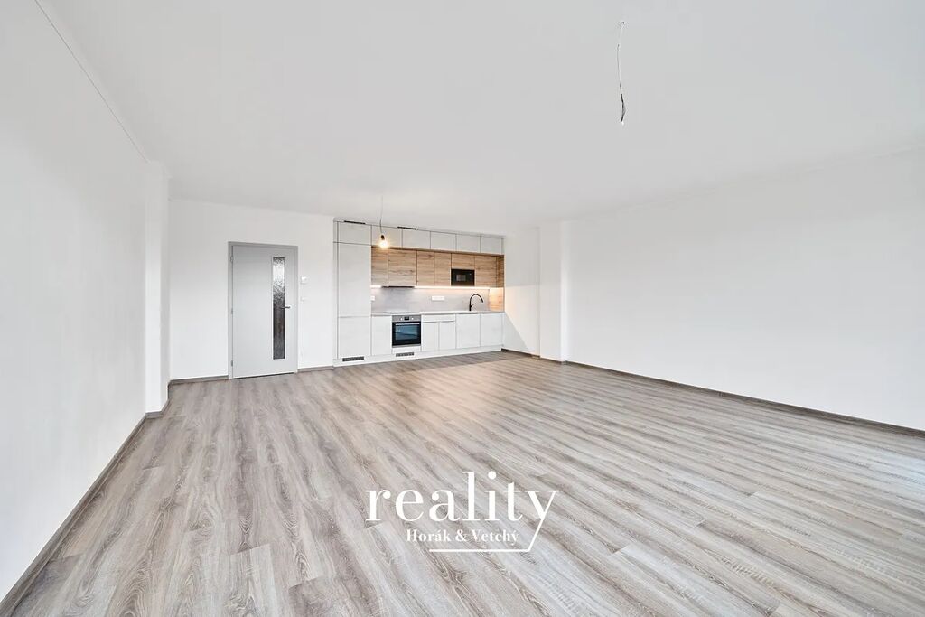 Byt je vybaven novou kuchyňskou linkou na míru s vestavnými spotřebiči. Na oknech jsou předokenní žaluzie.
