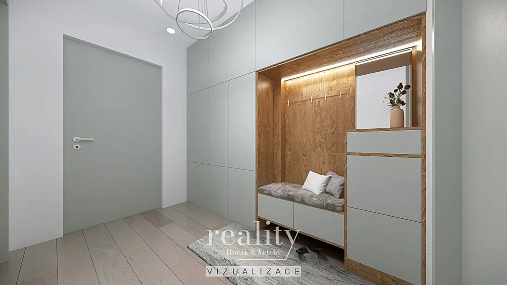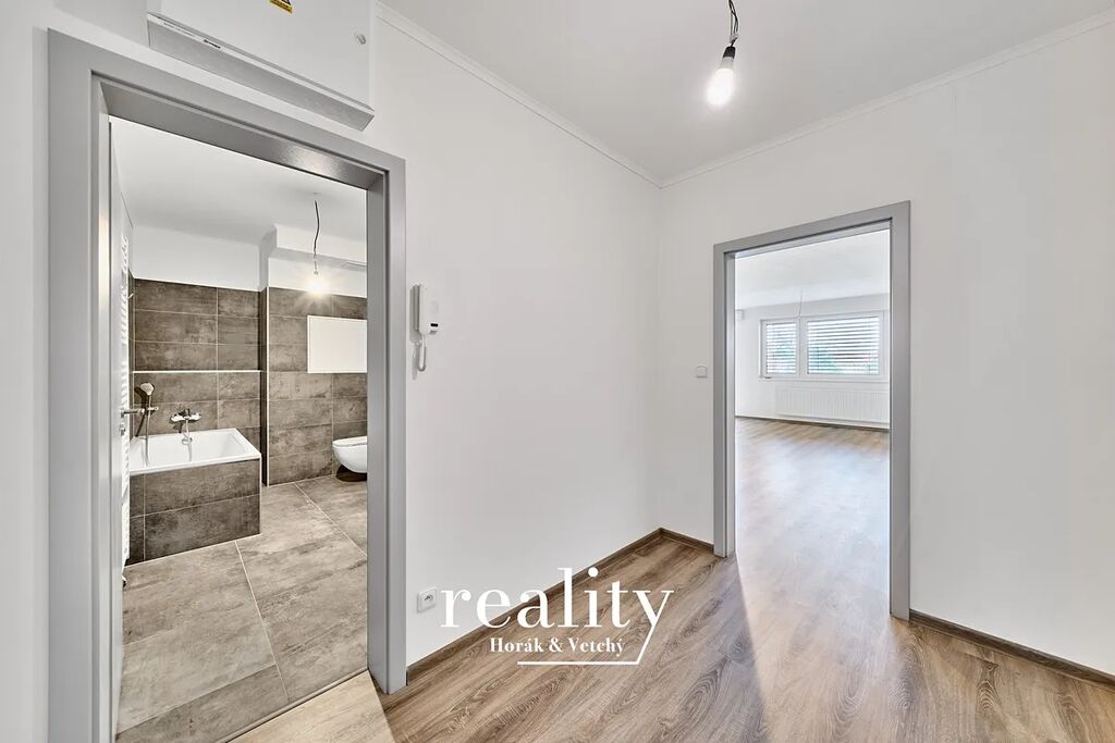 Při vstupu do bytu je předsíň o velikosti 6 m2, ze které je přímý vstup do koupelny s vanou (8 m2).