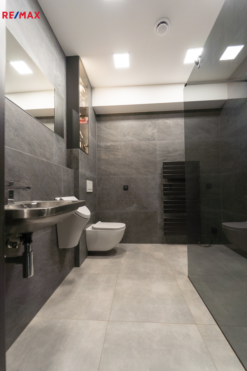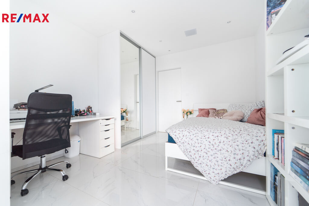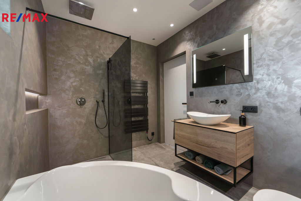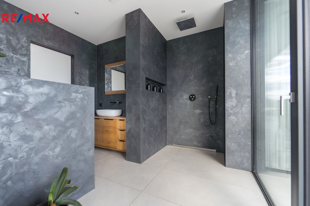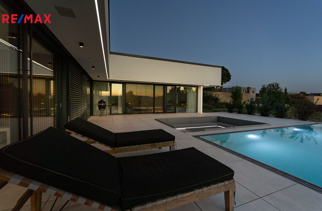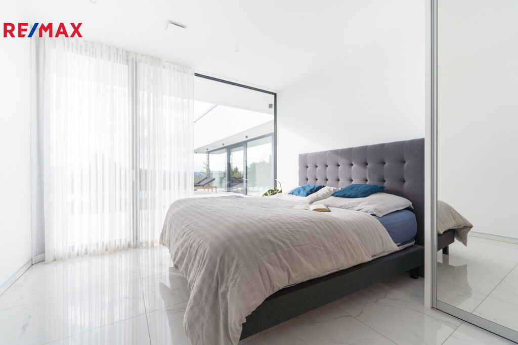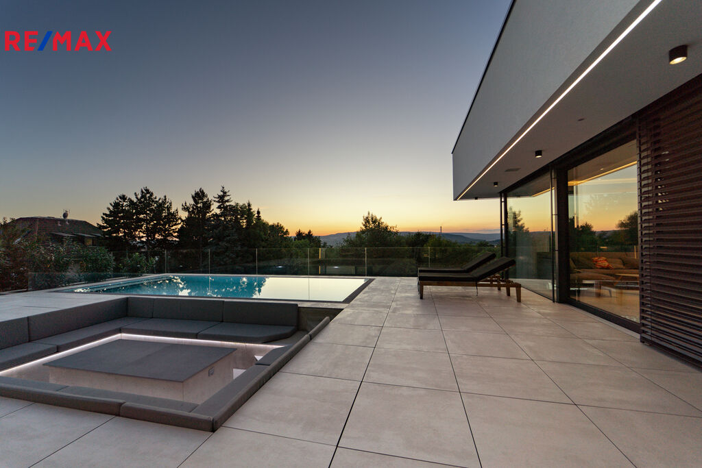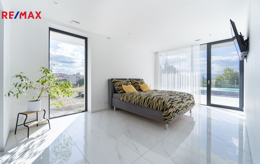 Součástí je i hlavní ložnice s walk-in šatnou a vlastní koupelnou, další dva pokoje, pracovna, dvě koupelny, vstupní hala a technické zázemí. Ze všech obytných místností je přímý vstup na terasu, takže propojení interiéru s exteriérem působí naprosto přirozeně.