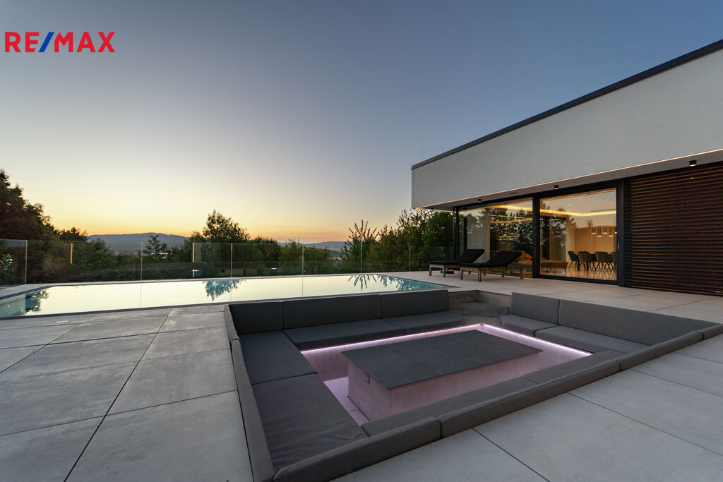 Velkoryse řešená terasa se slaným bazénem je srdcem celé rezidence. Představte si letní večery, kdy zapadne slunce za horizont Brd, voda v bazénu jemně odráží světla a vy si užíváte klid a naprosté soukromí. Zapuštěné venkovní posezení se stává ideálním místem pro rodinné chvíle i společenská setkání s přáteli.