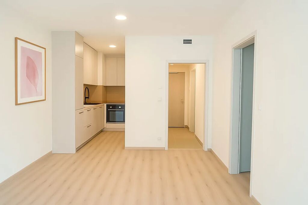 Byt se pronajímá nezařízený, k dispozici je nová moderní kuchyňská linka vybavená spotřebiči – lednicí, sporákem, troubou, mikrovlnnou troubou, myčkou a digestoří.