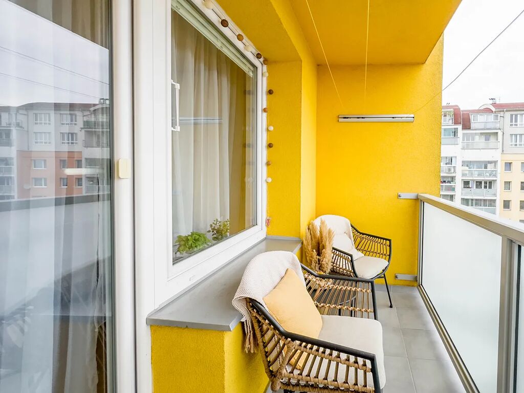 Ze vstupní haly, která slouží zároveň jako šatna, je přístupna luxusní koupelna s rohovou vanou. Toaleta s umyvadlem je řešena také jako samostatná místnost. Následuje poté prostorná kuchyně s jídelním koutem a na míru navrženou kuchyňskou linkou se zabudovanými spotřebiči, která zajistí budoucímu majiteli dostatek prostoru k vaření či uložení nádobí. Z kuchyně je přístupný prostorný balkon. Ze vstupní haly se dostanete do ložnice s vestavěnými skříněmi. Na obývací pokoj navazuje prosvětlená pracovna, kterou lze využít i jako dětský pokoj. Bytová jednotka působí velice pozitivním světlým dojmem, přičemž z oken jsou krásné výhledy do okolí.