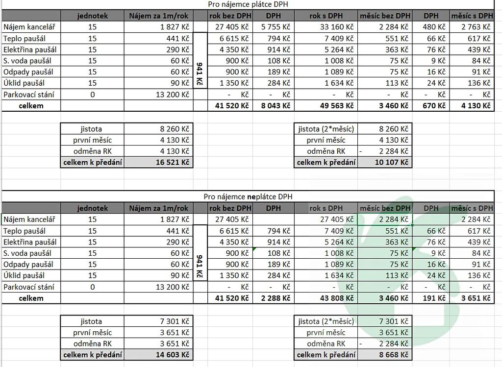 cena bez služeb ve výši 941,- Kč/m2/rok