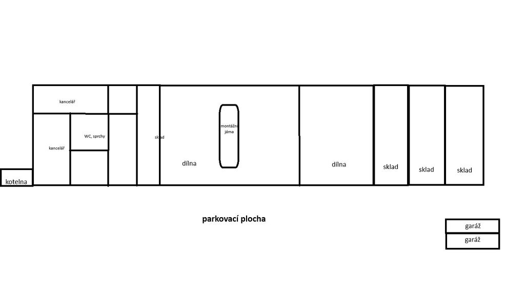 Jedinečný prostor včetně velké parkovací plochy před garážemi. Lze přidružit i místnosti k obývání či vytvořit několik kanceláří. Rozložení budovy: