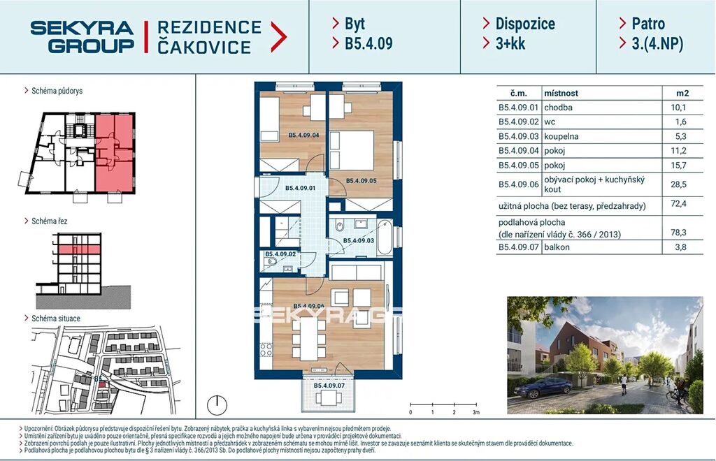 Dovolujeme si Vám nabídnout k prodeji byt 3+kk o výměře 78,3 m² s balkónem 3,8 m² v rezidenčním projektu Rezidence Čakovice, etapa B