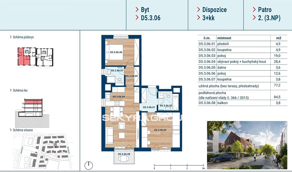 Dovolujeme si Vám nabídnout k prodeji byt 3+kk o výměře 84,5 m² s balkónem 3,8 m² v rezidenčním projektu Rezidence Čakovice.