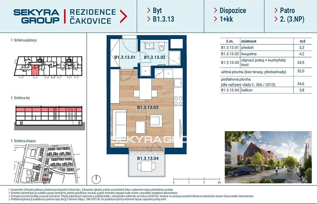 Dovolujeme si Vám nabídnout k prodeji byt 1+kk o výměře 34,6 m² s balkónem 3,8 m² v rezidenčním projektu Rezidence Čakovice, etapa B.