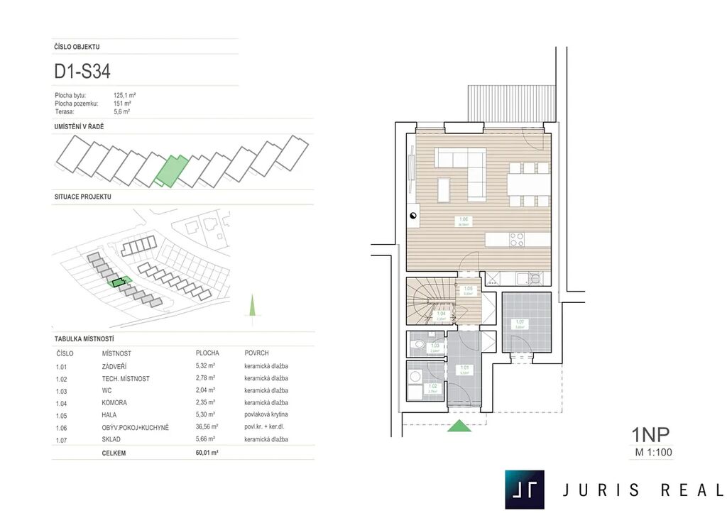 Řadové domy mají dispozici 5+KK. Přízemí je projektováno na prostorný obývací pokoj s otevřenou kuchyní, jídelnou a vstupem na terasu, na niž naváže zahrada. Dále se zde nachází velká vstupní hala, toaleta, technická místnost a schodišťová chodba, spolu se skladem pro uložení sezonních věcí, který je přístupný z venkovního parkovacího stání. Po chodbě se schodištěm se dostanete do 4 pokojů a 2 koupelen.