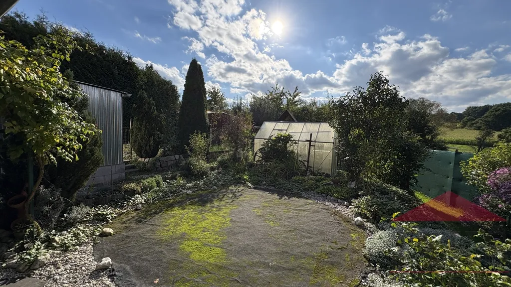 Zahrada: 587 m2 Schovaná za domem, oplocená, udržovaná, slunná, pěstěná zahrada s vyrovnaným místem na bazén či trampolínu, plodícími ovocnými stromy (jabloně, švestky, hruška a nektarinka) a keři (jahody, maliny, ostružiny, víno, rybíz...) a brankou s vjezdem na polní cestu.