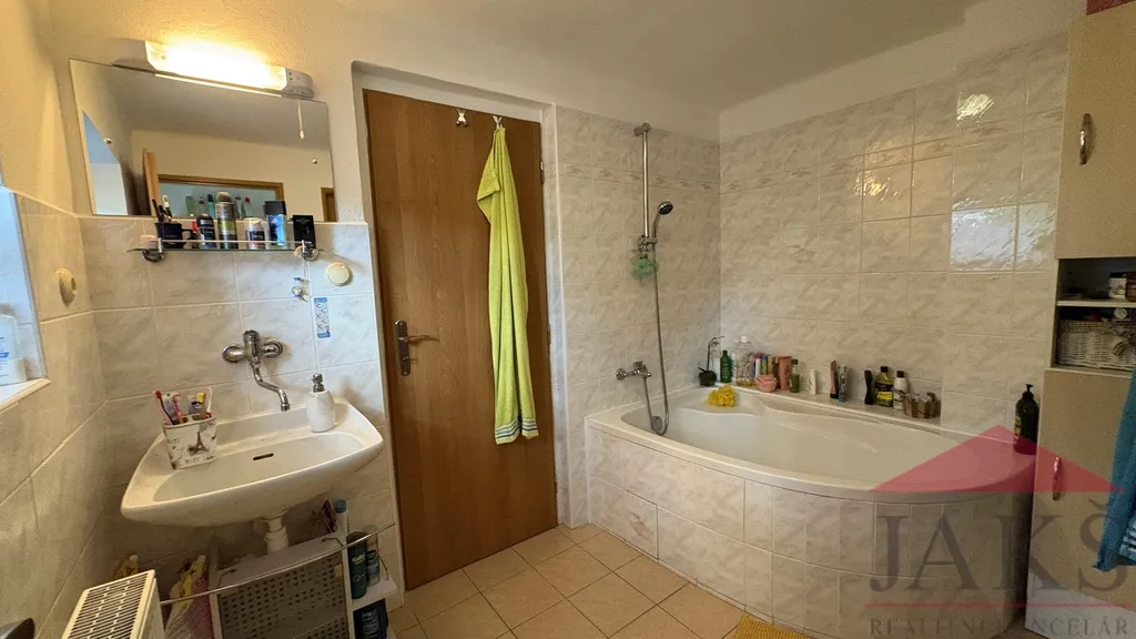 Popis: část. podsklep.: sklep s klenbou (sklad potravin); přízemí: vstupní chodba se schodištěm, kuchyň (kuch. linka na míru s vest. spotřebiči: HV trouba, MV trouba, sklo-ker. deska, digestoř a myčka) s jídelnou a franc. oknem na okrasnou zahradu, průchozí koupelna (rohová vana, umyv. se skříňkou a zrcadlem, oddělené WC) do prádelny (vývody na pračku) a kotelny, obývací pokoj a ložnice; podkroví: podesta, koupelna (nedokončená; chybí osadit sanita, dlažba a obklad), 2x ložnice a půdička.