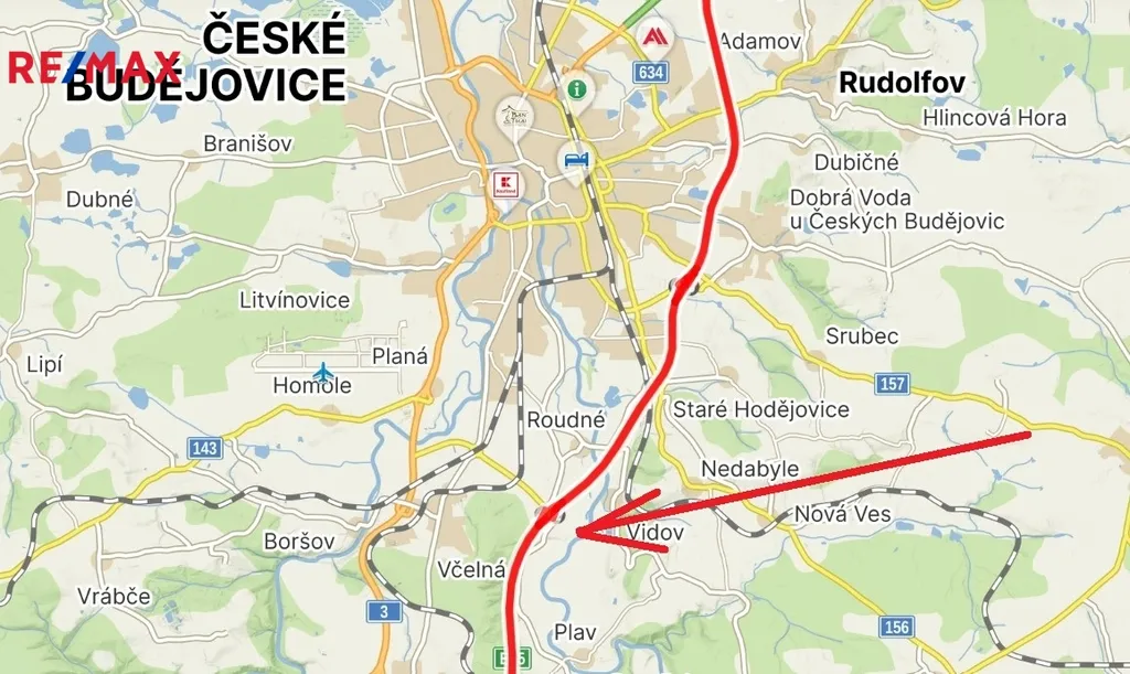 Tento pozemek nabízí vysoký investiční potenciál díky poloze u hlavní dopravní tepny Praha–České Budějovice–Rakousko.
