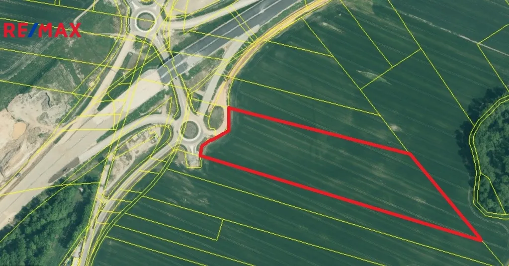 Pozemek má lichoběžníkový tvar, výbornou dopravní dostupnost a přímou viditelnost z dálnice – ideální poloha pro developerský projekt komerčního využití.