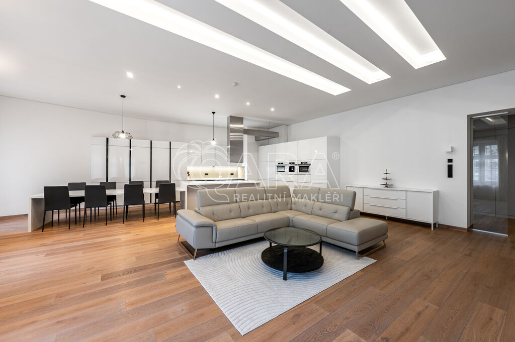Pronájem designového, špičkově vybaveného luxusního bytu, 3kk, 186m2 v 1. patře nákladně rekonstruované residence. Lokalita v srdci metropole je perfektně dostupná MHD, autem i na kole a nabízí překvapivě klidné a příjemné městské bydlení se všemi službami v bezprostřední blízkosti.