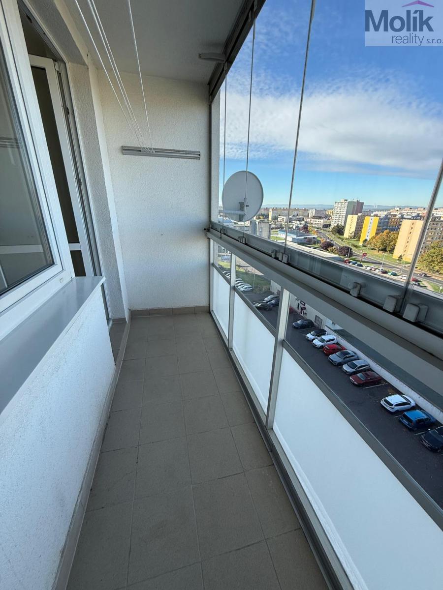 Součástí bytu je zasklená lodžie, která nabízí příjemné místo k odpočinku s pěkným výhledem.