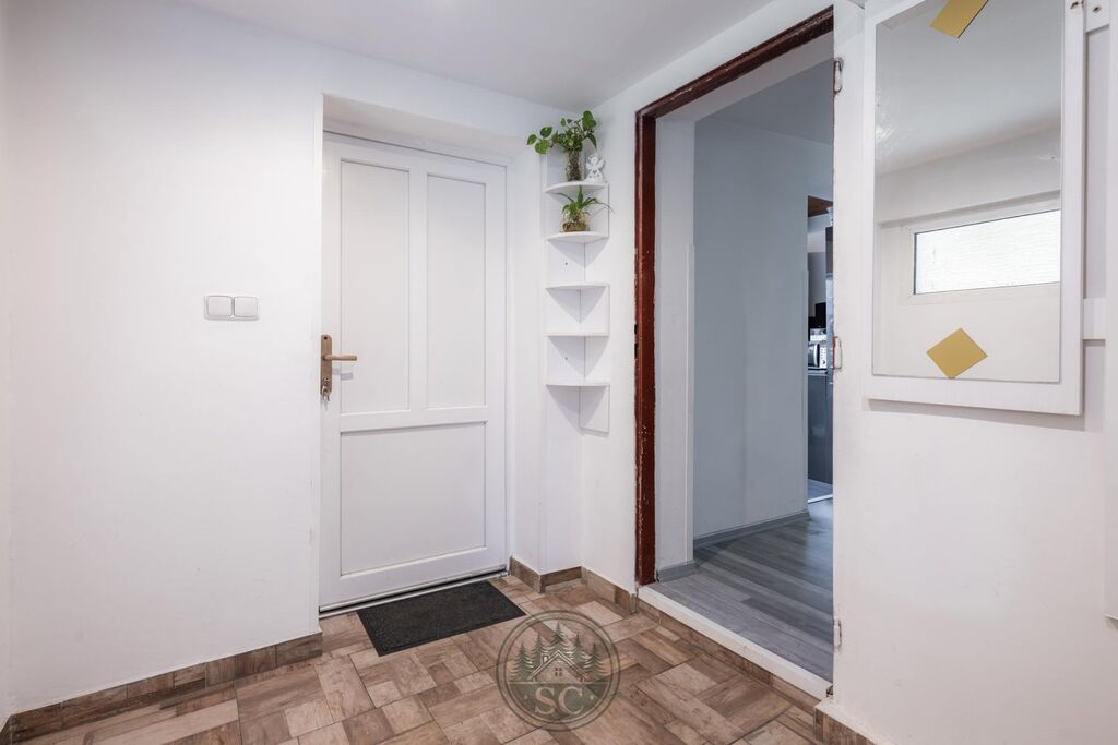 Dispozice domu je promyšlená a útulná. Vstupem se dostanete do předsíně, dále se zde nachází kuchyň s linkou a sporákem, obývací pokoj, ložnice, dvě menší místnosti (jedna slouží jako spíž), zrekonstruovaná koupelna se sprchovým koutem a WC. V kuchyni vynikají krásné stropní trámy, které prostoru dodávají příjemnou venkovskou atmosféru. V podkroví je ložnicová část rozdělená na dva dětské pokoje - i zde jsou dřevěné trámy, které interiéru dodávají osobitý charakter - a další samostatné WC. Ze schodišťové chodby je umožněn přístup na střechu i do půdních prostor.