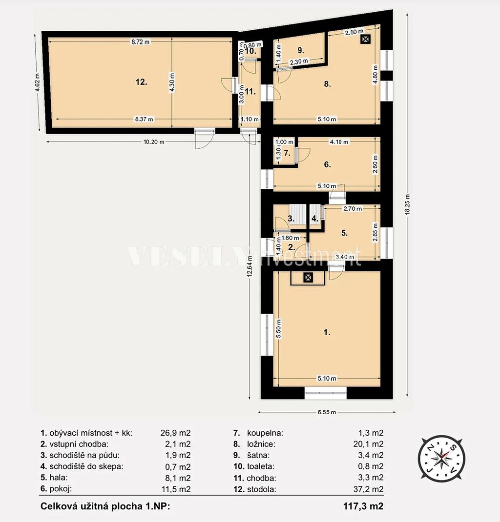 Vstup do domu tvoří vstupní chodba (2,1 m2) se vstupem na schodiště do 2 NP, půdních prostor. Z chodby je dále vstup do vstupní haly (8,1m2) situován vstup na schodiště -1NP sklepní prostor, dále pak vstup do obývací místnosti (26,9 m2) a do pokoje (11,5m2)V 1.NP se také nachází druhý vstup do nemovitosti, nalevo od vstupních dveří, který pokračuje chodbou (3,3 m2), vstup do WC (0,8 m2), vstup do ložnice (20,1 m2) a z ložnice do šatny (3,4 m2)