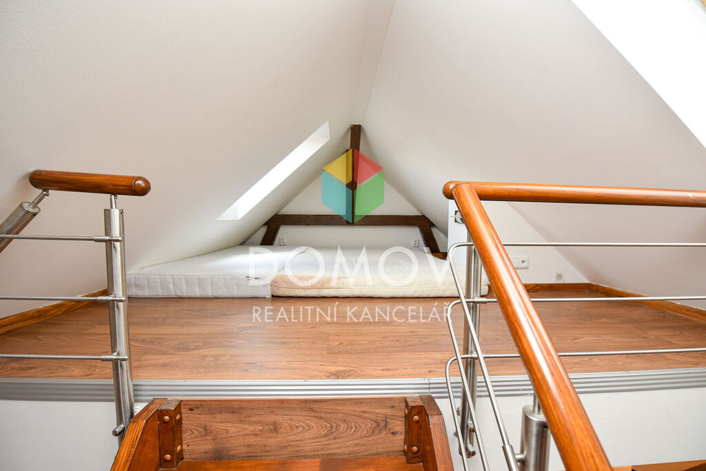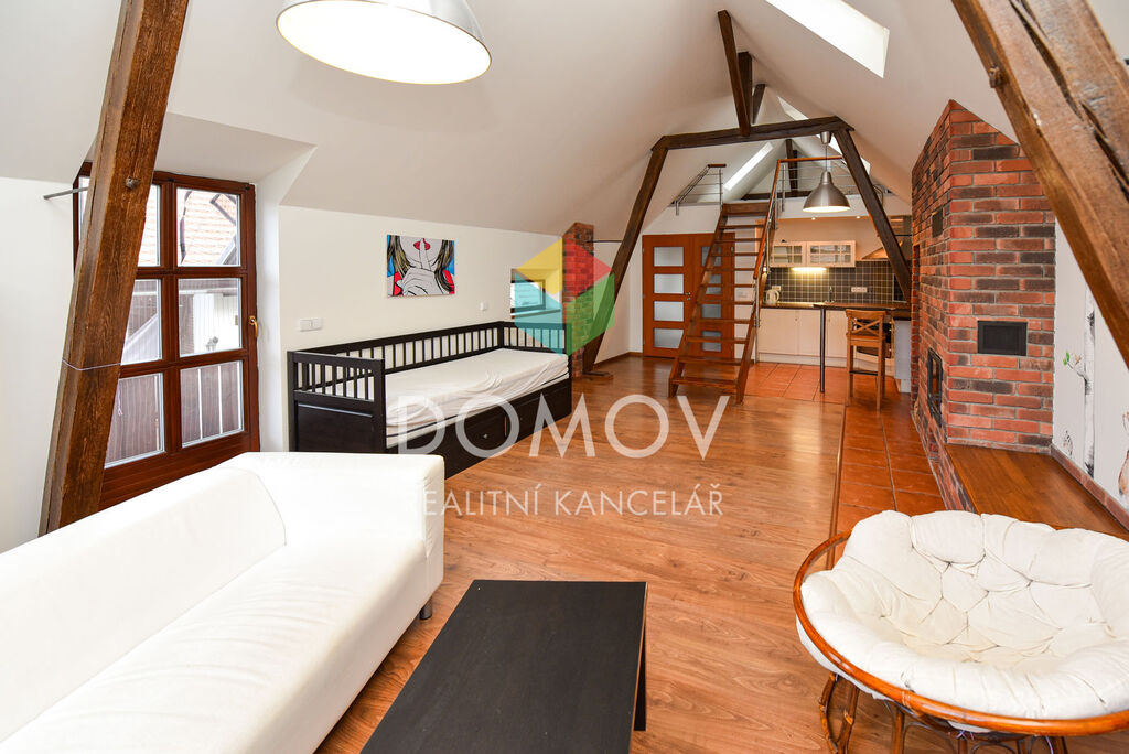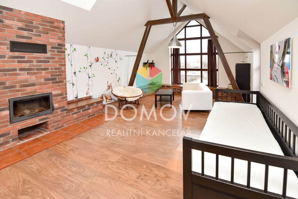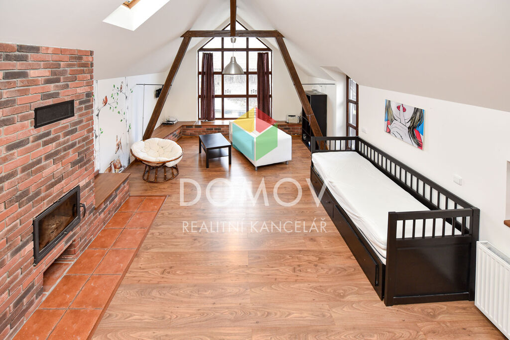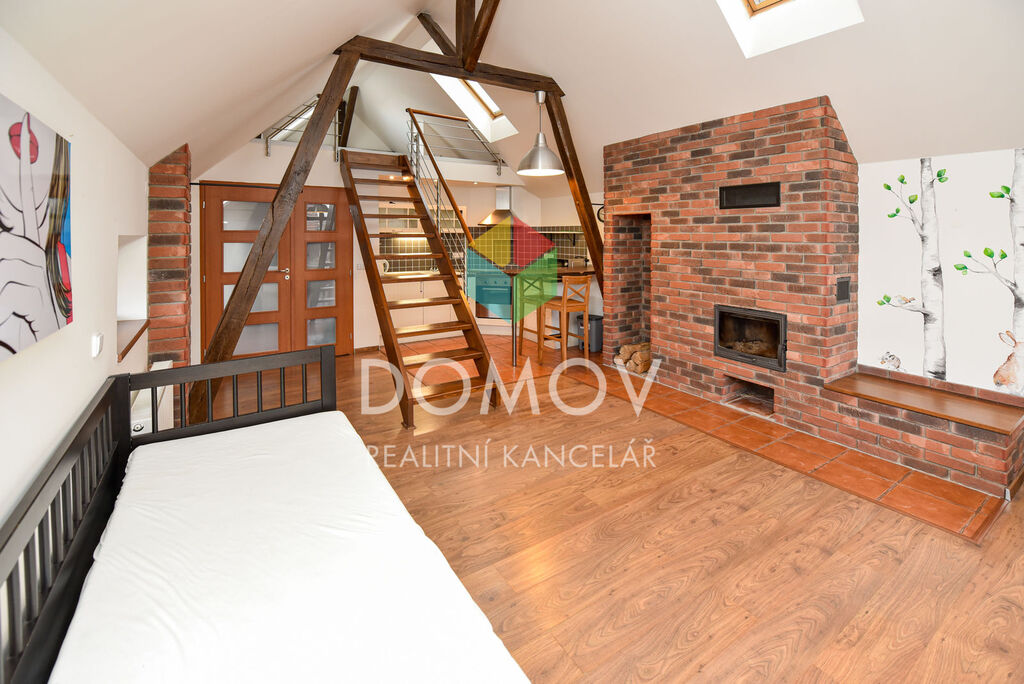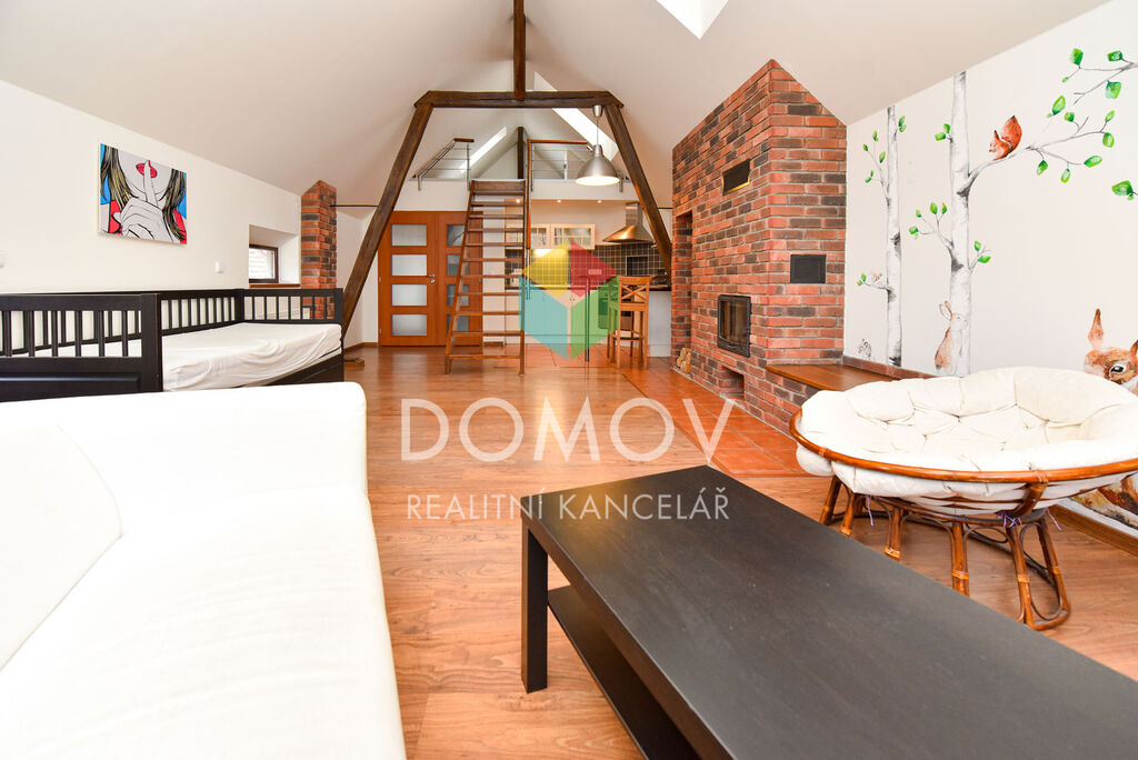 Jeho dispozice se skládá ze vstupní chodby s vestavěnými skříněmi, koupelny s toaletou, která je vybavena sprchovým koutem a pračkou, dále pak velmi prostorným a částečně zařízeným obývacím pokojem s kuchyňským koutem. Ten je vybaven kuchyňskou linkou, el. varnou deskou, troubou, digestoří a menší vestavěnou lednicí. V druhé části obývacího prostoru se nachází krb, sedačka, křeslo, konferenční stolek, police, postel. Velkou výhodou bytu je možnost spaní v mezonetu, máte tak částečně oddělenou ložnici od obývacího pokoje.