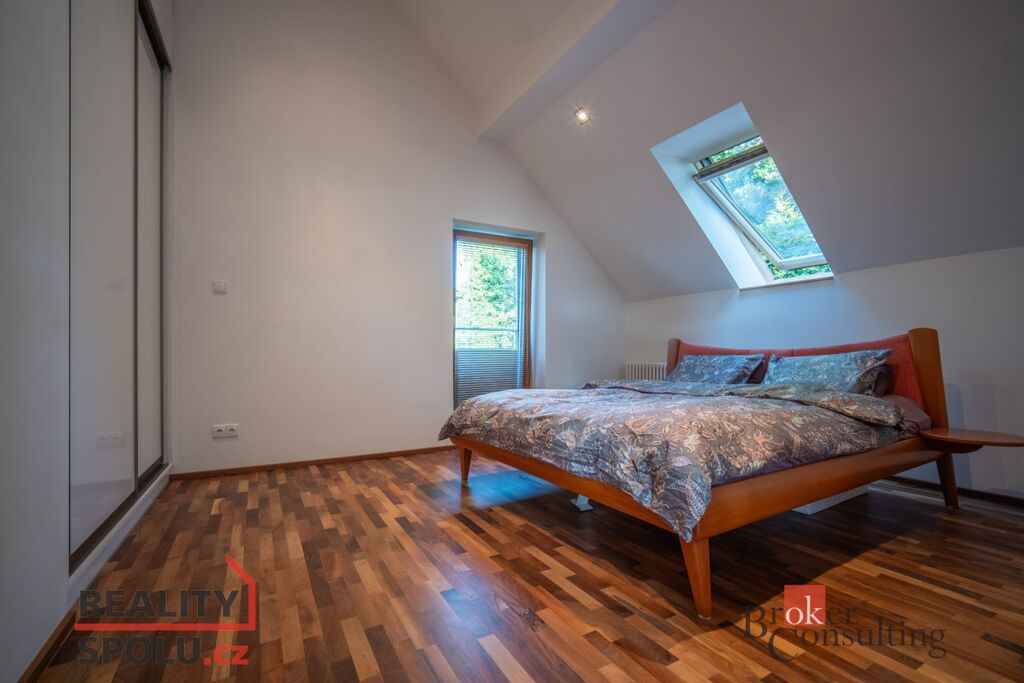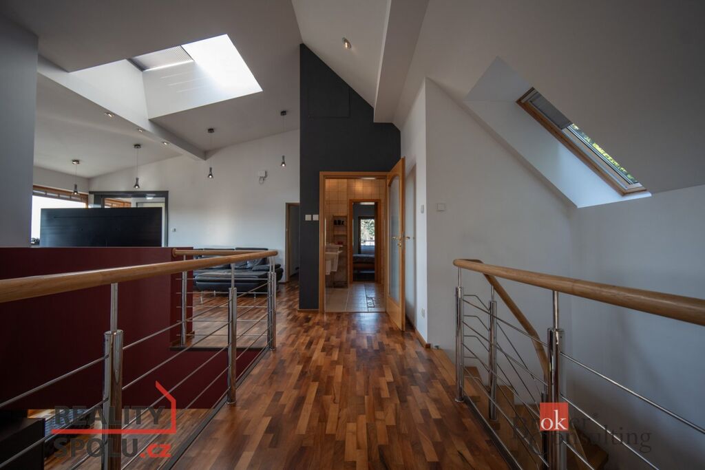 Dům má podlahovou plochu téměř 200m2 a k tomu 2 garáže. Stojí na svažitém, upraveném pozemku (723 m²) se vzrostlými stromy a na konci slepé ulice Za Mototechnou. Díky tomu, že dům stojí v horní části pozemku (nad garáží), máte úžasné výhledy jak z přízemí, kde je velká terasa a část zahrady, tak samozřejmě i v prvním patře domu.