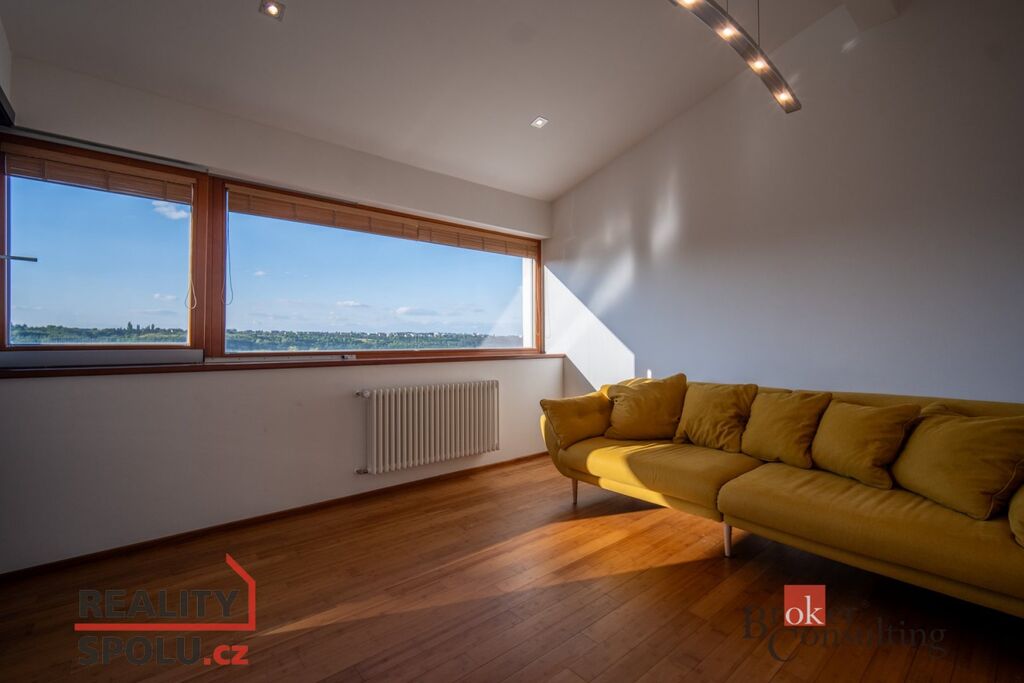 V přízemí domu se nachází velký obývací pokoj s kuchyní, koupelnou a vstupem do další části domu kde je vnitřní bazén a infrasauna. Tato část domu má 100 m2. Ve druhém patře je atrium, vstup do třech pokojů, na terasu a do koupelny. Hlavní ložnice má samostatný vstup do koupelny. Podlahy jsou dřevěné a v pokojích vestavěné skříně. Úžasné je prosklení, které je po celé délce severozápadní stěny s výhledem na část Prahy 5 a dále – Motol, Ladronku až po Břevnov.