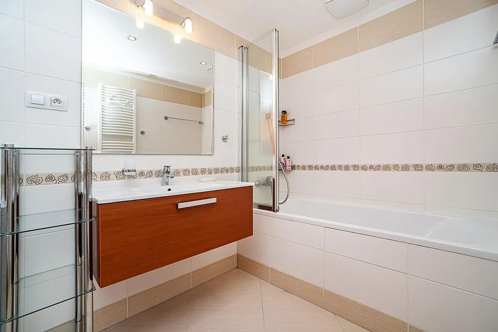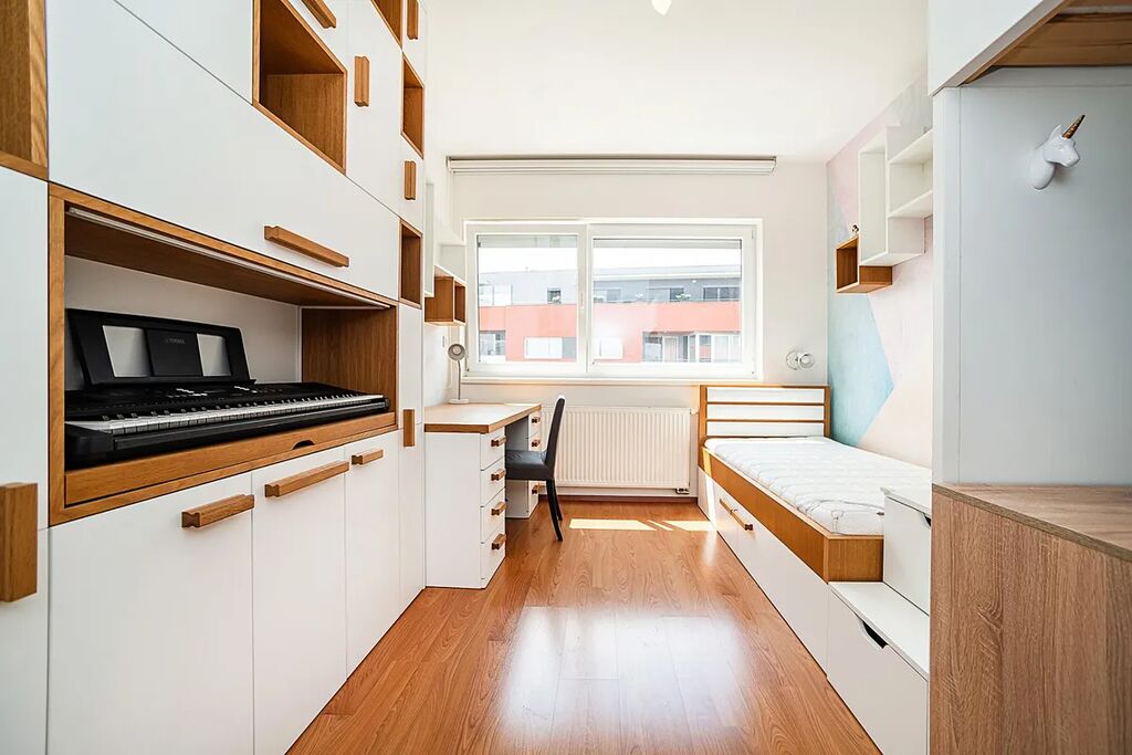 V bytě najdete prostorný obývací pokoj s kuchyňským koutem a vstupem na terasu. V této místnosti je také klimatizační jednotka. Téměř celou jednu stěnu tohoto pokoje tvoří okna, díky nimž je celý prostor krásně prosvětlený. Na oknech jsou elektricky ovládané předokenní žaluzie. Dále zde najdete ložnici a velkorysý dětský pokoj s vestavěným nábytkem na míru. Samozřejmostí je samostatná toaleta a prostorná koupelna s vanou.