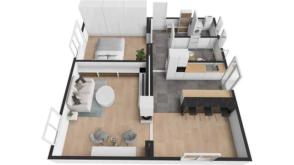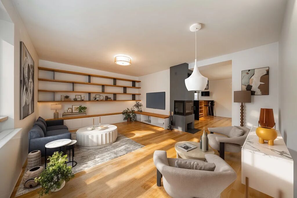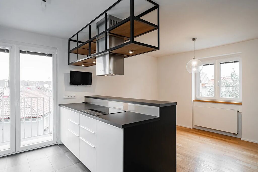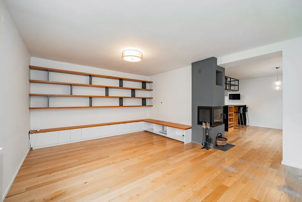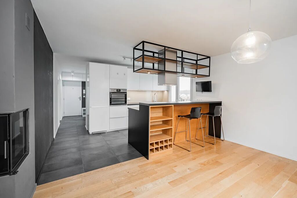 K vybavení bytu patří kvalitní bezpečnostní dveře, kuchyňská linka s kompletními spotřebiči, nábytek zhotovený a vestavěný na míru, podlahové topení instalované v části bytu a výkonná krbová kamna.