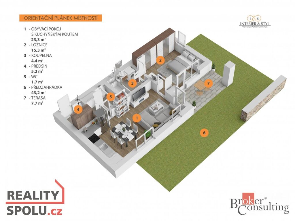Byt je umístěn v 1. podlaží novostavby s výtahem. Předností bytu je jeho promyšlená dispozice a kompletní vybavení. Je rozdělen na ložnici (neprůchozí), obývací pokoj s kuchyňským koutem, koupelnu, samostatné wc, terasu a zahradu (viz plánek). Díky nainstalovaným fotovoltaickým panelům také ušetříte na účtech za elektřinu.