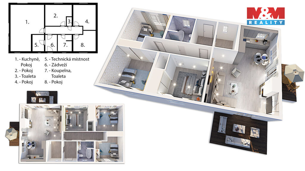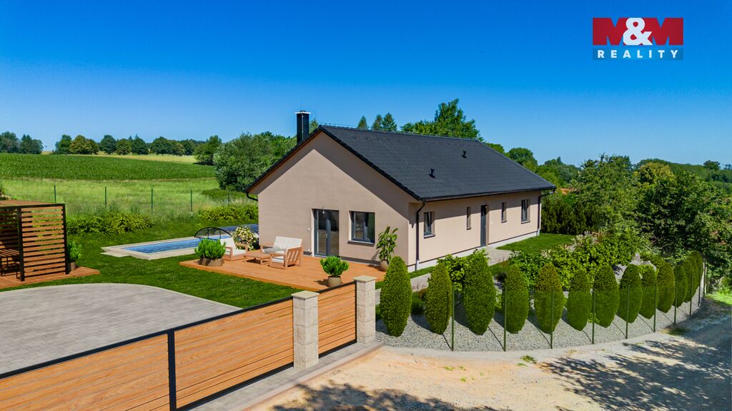 Novostavba zděného rodinného domu o podlahové ploše 114 m² s pozemkem 1007 m² v obci Slavětín u Načeradce, 20 minut od Tábora a 50 minut od Prahy. Dům je ihned k nastěhování a nabízí možnost úprav exteriéru dle přání – bazén, pergola, chodníky i oplocení mohou být realizovány stávajícím majitelem. Vytápění tepelným čerpadlem, napojení na veřejný vodovod, elektroinstalace 230/400 V. Interiér zahrnuje koupelnu s vanou i sprchovým koutem, dvě WC a světlé obytné místnosti. Podlahy tvoří vinyl a dlažba, střecha je z betonových tašek. Oplocený pozemek s okrasnou zahradou nabízí prostor pro relax i volnočasové aktivity. Okolí tvoří lesy, louky, rybníky – ideální pro milovníky přírody, turistiky, cyklovýletů i zimních sportů. Příjezdová cesta je zpevněná, parkování možné na pozemku i u domu. Pro více informací kontaktujte makléře.