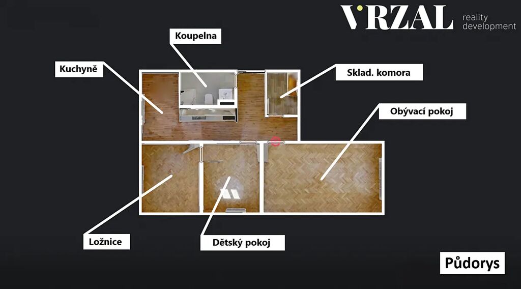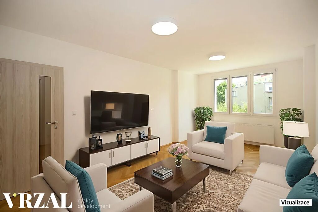 Dispozičně se byt skládá z velkého obývacího pokoje, kuchyně vybavené novou kuchyňskou linkou s myčkou, el. troubou, varnou deskou s digestoří a dřezem s baterií. Dále jsou zde k dispozici další dva pokoje/ ložnice. Ze vstupní chodby je přístup do koupelny se sprchovým koutem, toaletou a umyvadlem, dále pak do praktické komory/ šatny. TIP – 3D virtuální prohlídka bytu v nabídce.