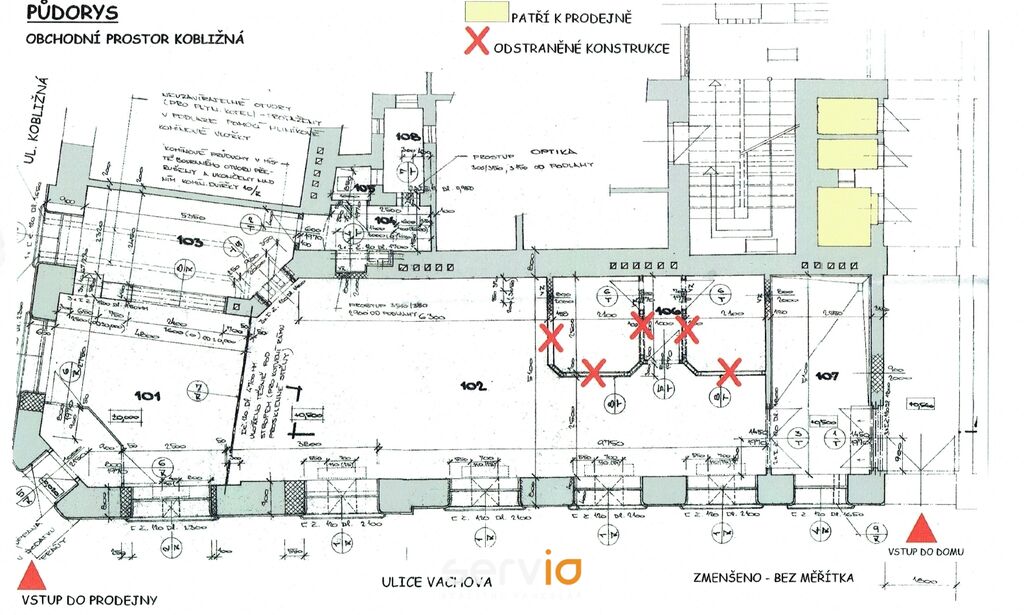 V 90. letech se původně jednalo o dvě obchodní jednotky nyní sloučené v jednu velkou rohovou prodejnu, která má vstup z nároží domu, dva výkladce do ulice Kobližná a šest výkladců (z toho jeden původně vstup do druhé jednotky) do ulice Vachova. Vytápění je zajištěno vlastním plynovým kotlem. Nájemce má uzavřenu smlouvu s elektrárnou na dodávku el. energie a smlouvu s plynárnou na dodávku plynu k vytápění. Veškerá média jsou tedy samostatně měřena, a to včetně nákladů na vodné a stočné, jelikož prodejna je osazena i podružným vodoměrem měřícím tuto spotřebu. Prodejna má svoje vlastní sociální zázemí včetně kuchyňské linky a denní místnosti.